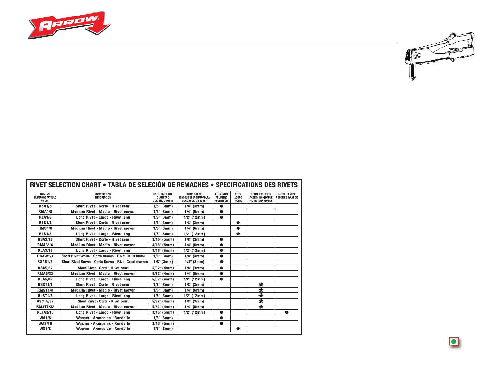 LOS REMACHES DE ACERO INOXIDABLE NO SON PARA USO CON HERRAMIENTAS DE REMACHE DE OPERACIÓN MANUAL.