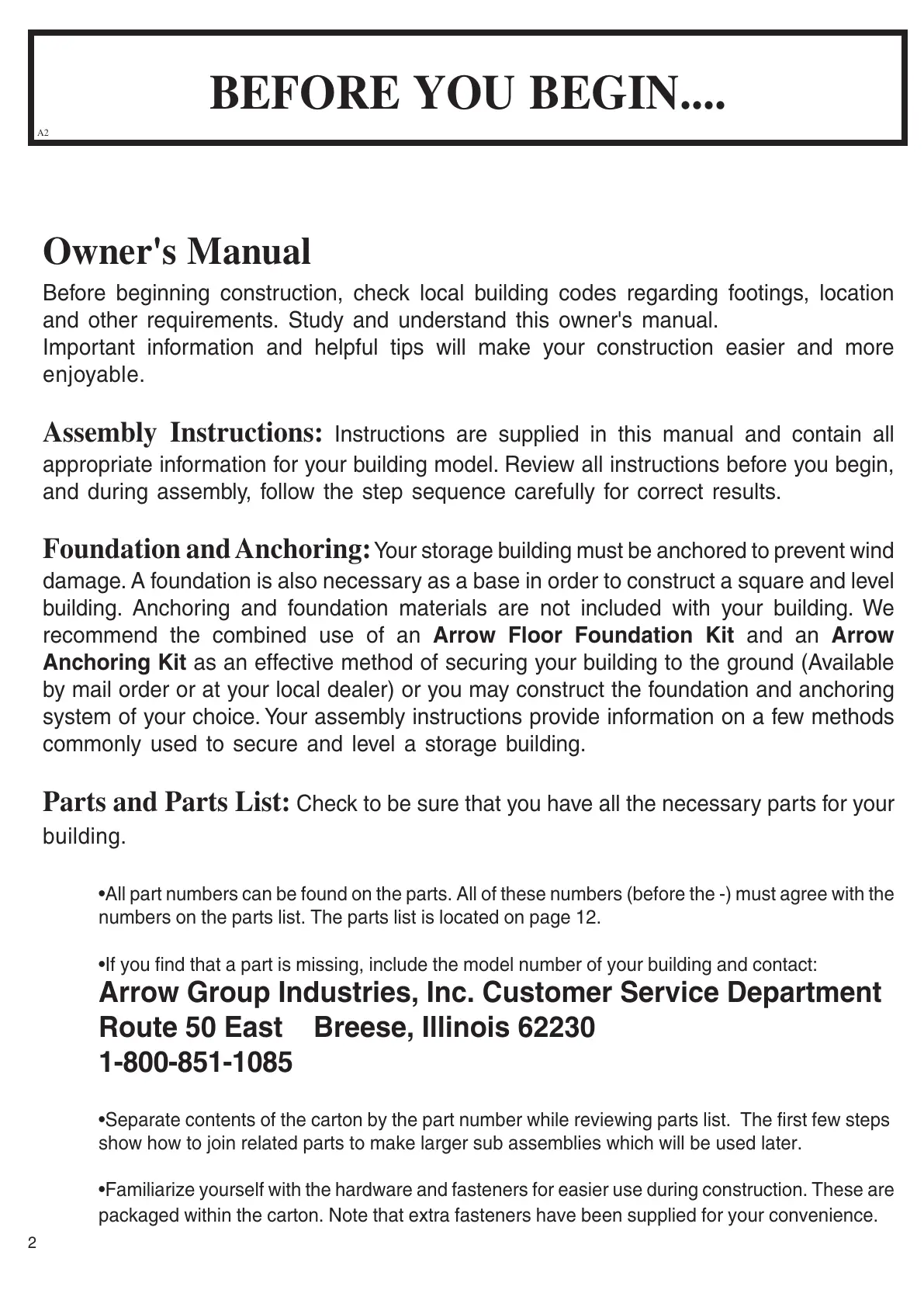 building. Anchoring and foundation materials are not included with your building. We