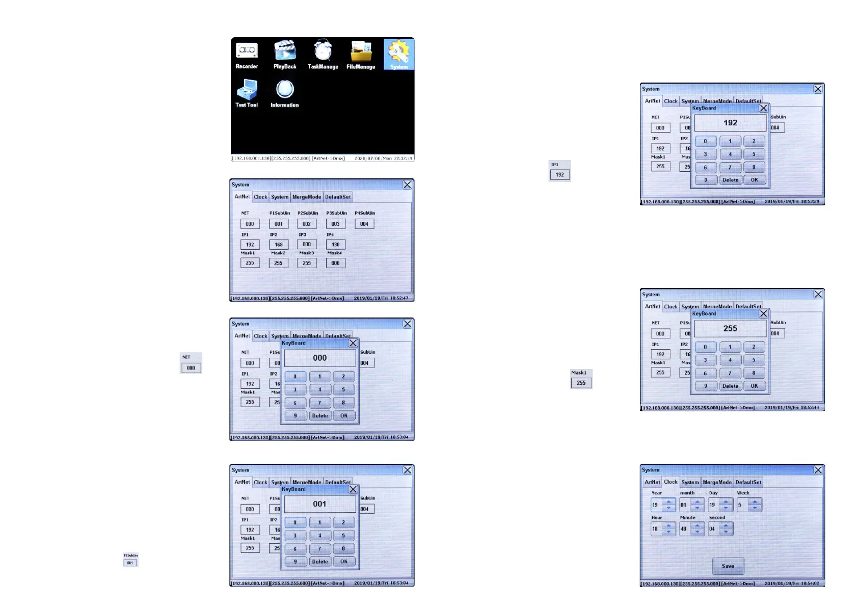 255.255.255.255 after set IP1-IP4 respectively. Once set, touch OK on the key board. Then close the System