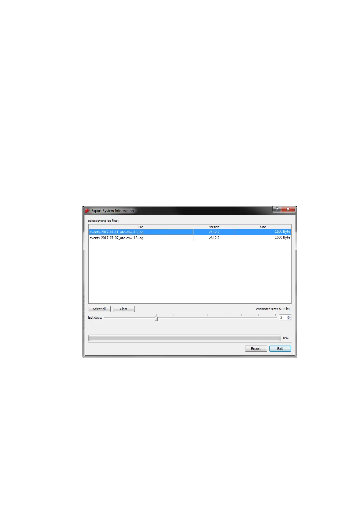 Pressing Export saves the selected event logs together with a system information file in