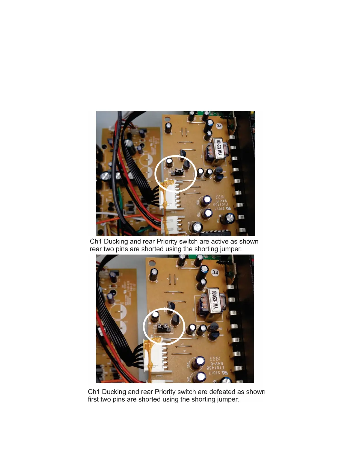 board in the unit. Moving this jumper disables the CH1 ducking feature and the rear priority feature.