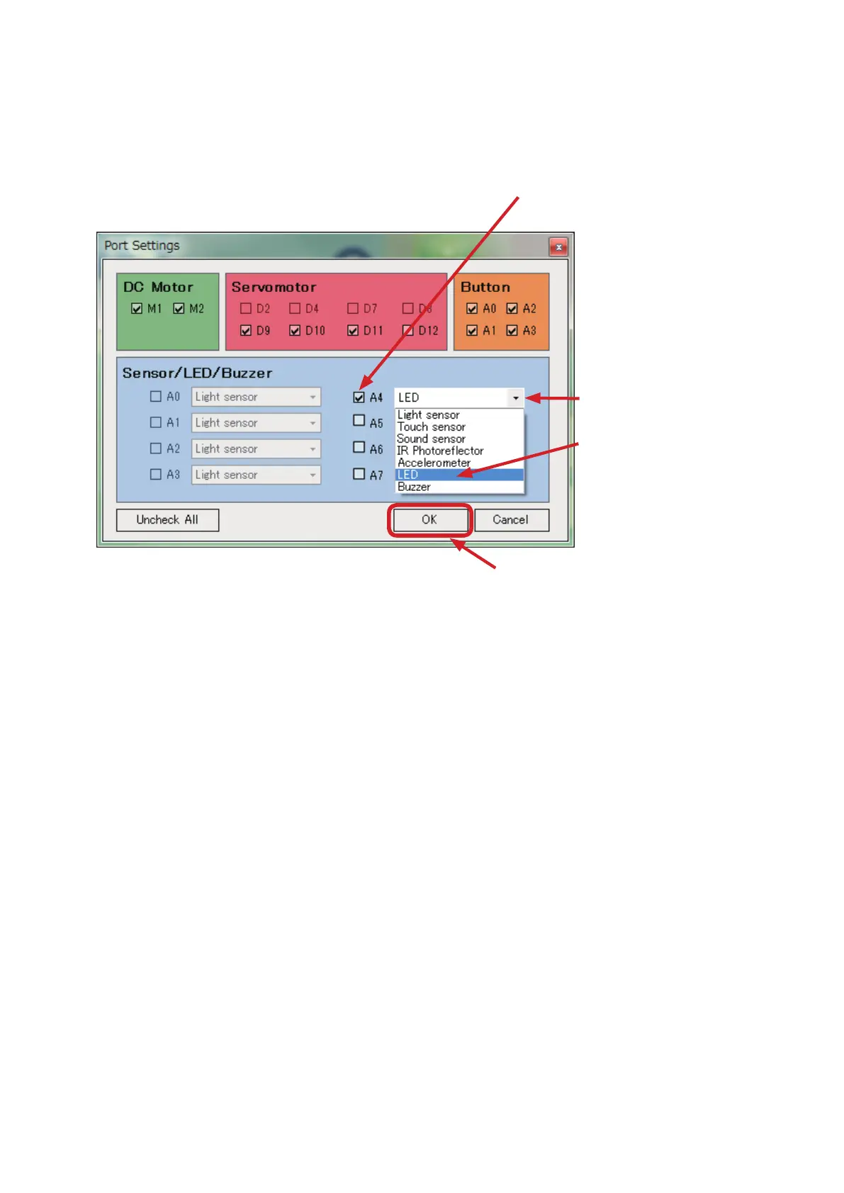You’ve now set the Studuino ports you’ll be using in the Block Programming Environment.