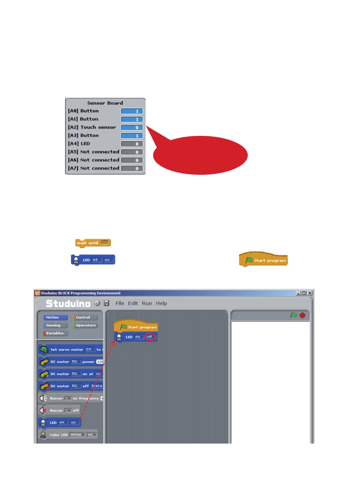 Now we’re going to program your LED to turn on when you press the Touch Sensor. We’ll also be learning