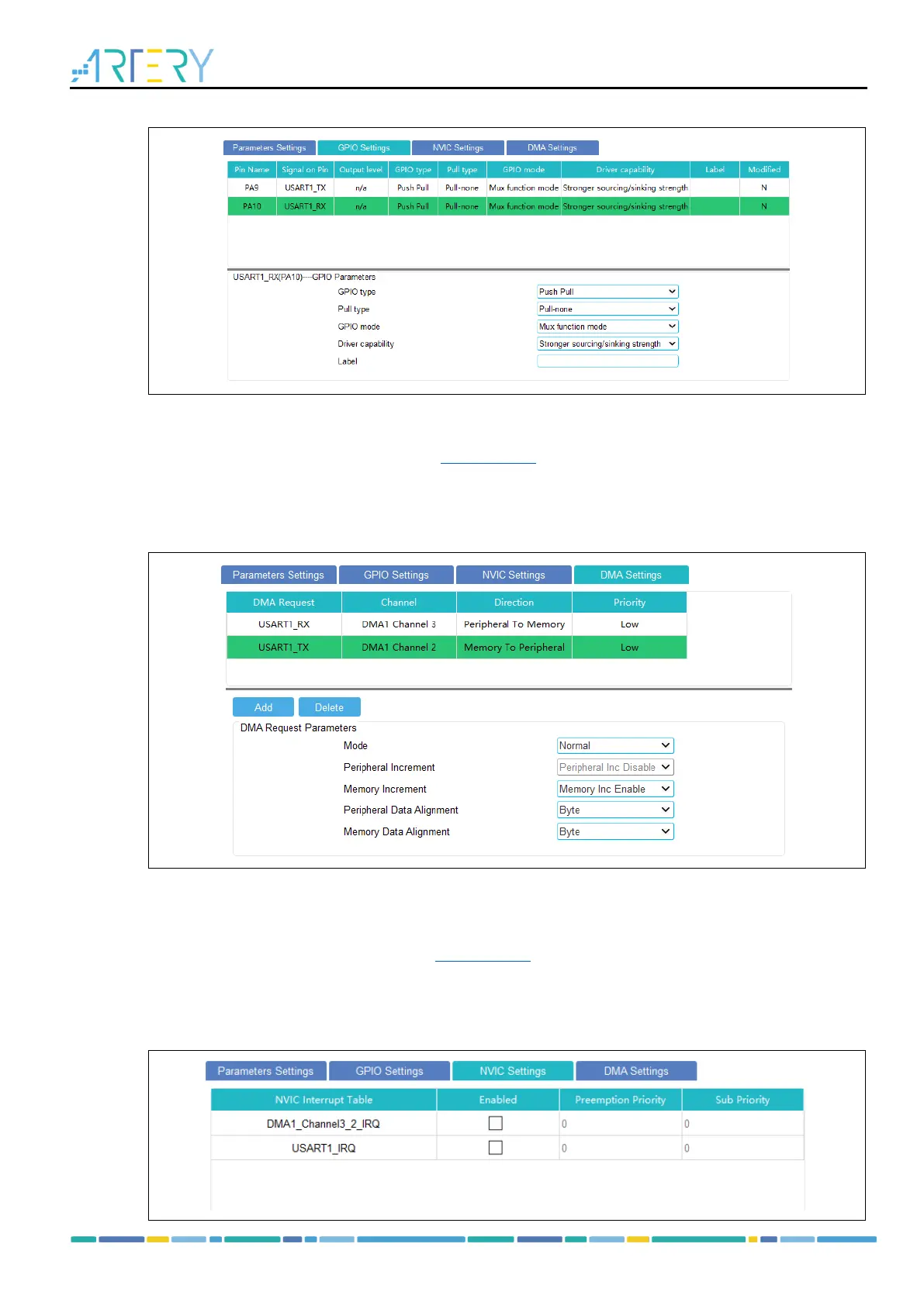 ARTERY AT32 - Figure 10. GPIO Settings; Figure 11. DMA Settings; Figure 12. NVIC Settings