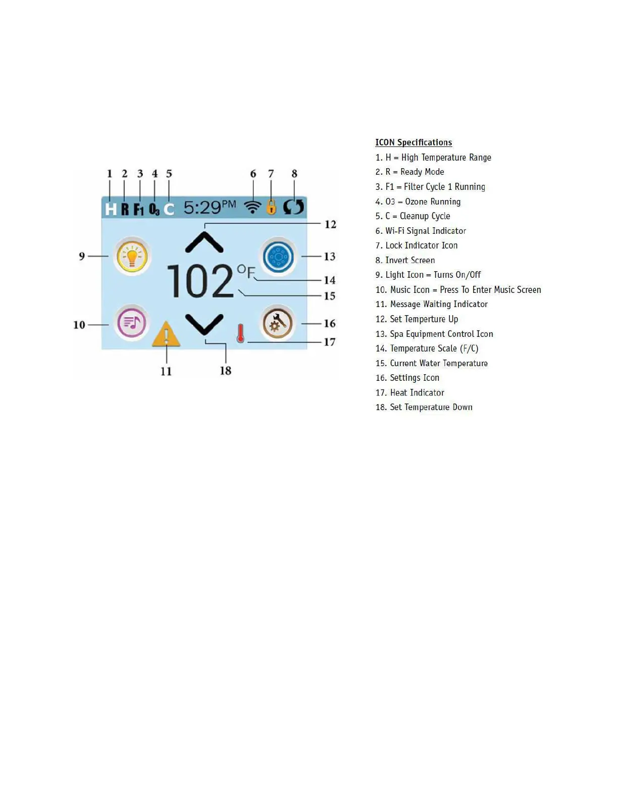Important information about spa operation can be seen quickly from the Main Screen.