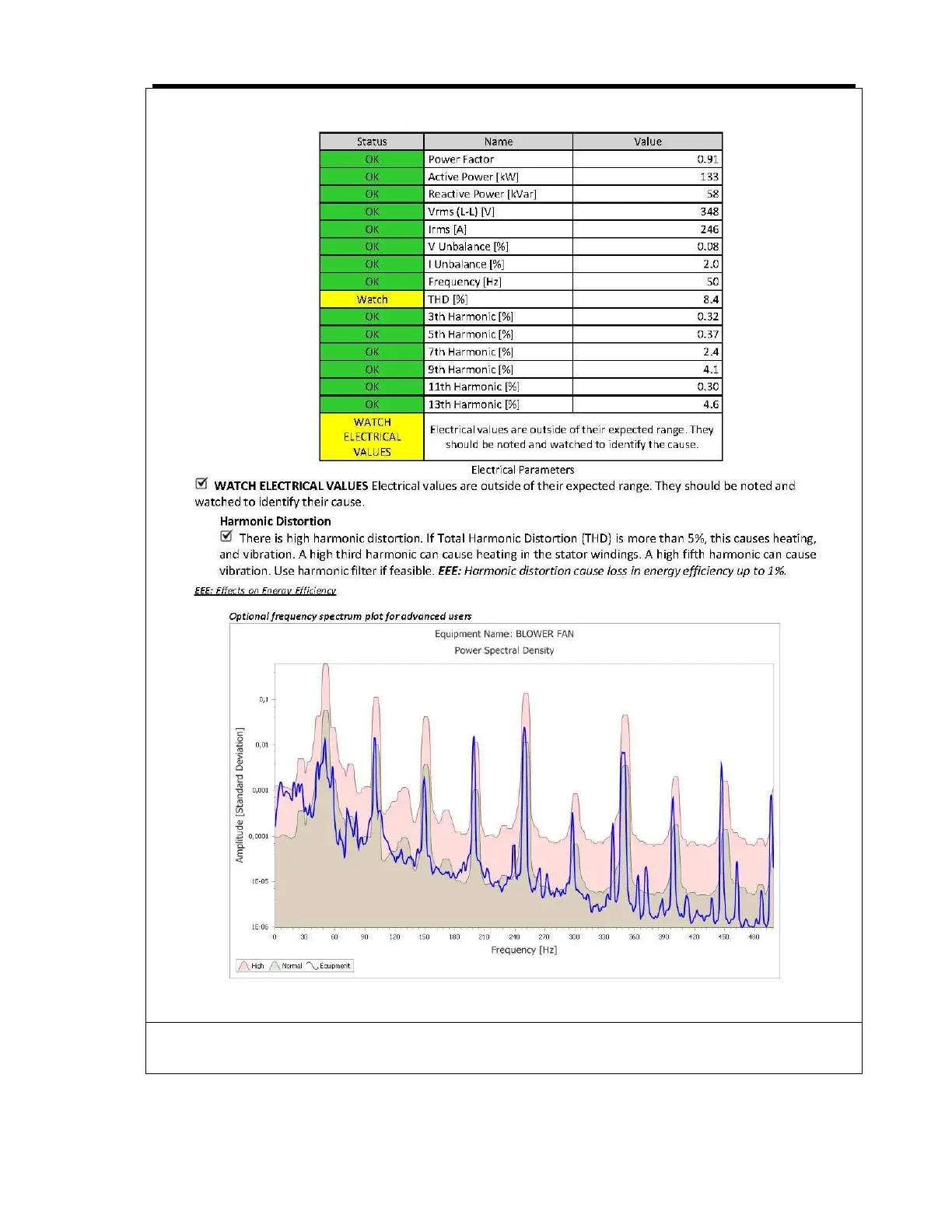 Sample Report with two pages including descriptions of existing faults, a chart displaying