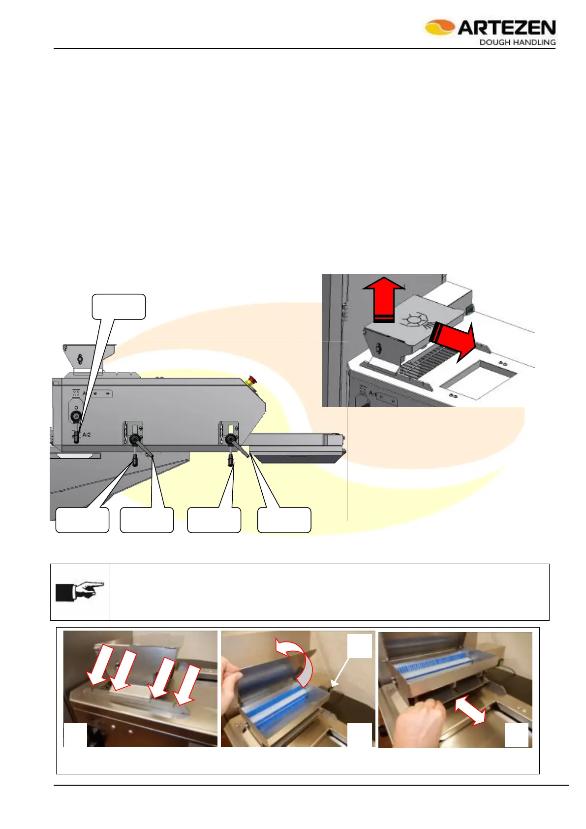 Ref. 1 Dough alignment adjustment lever. By turning it to position A:1, the product rows come out aligned,