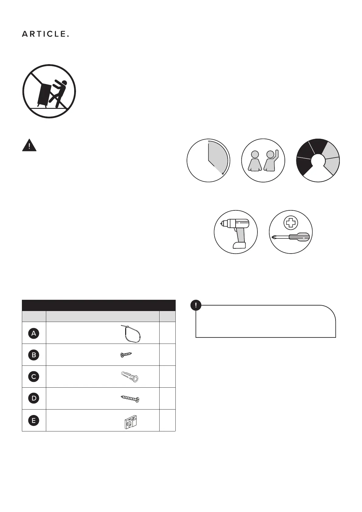 Hardware (C/D) to attach brackets to wall is