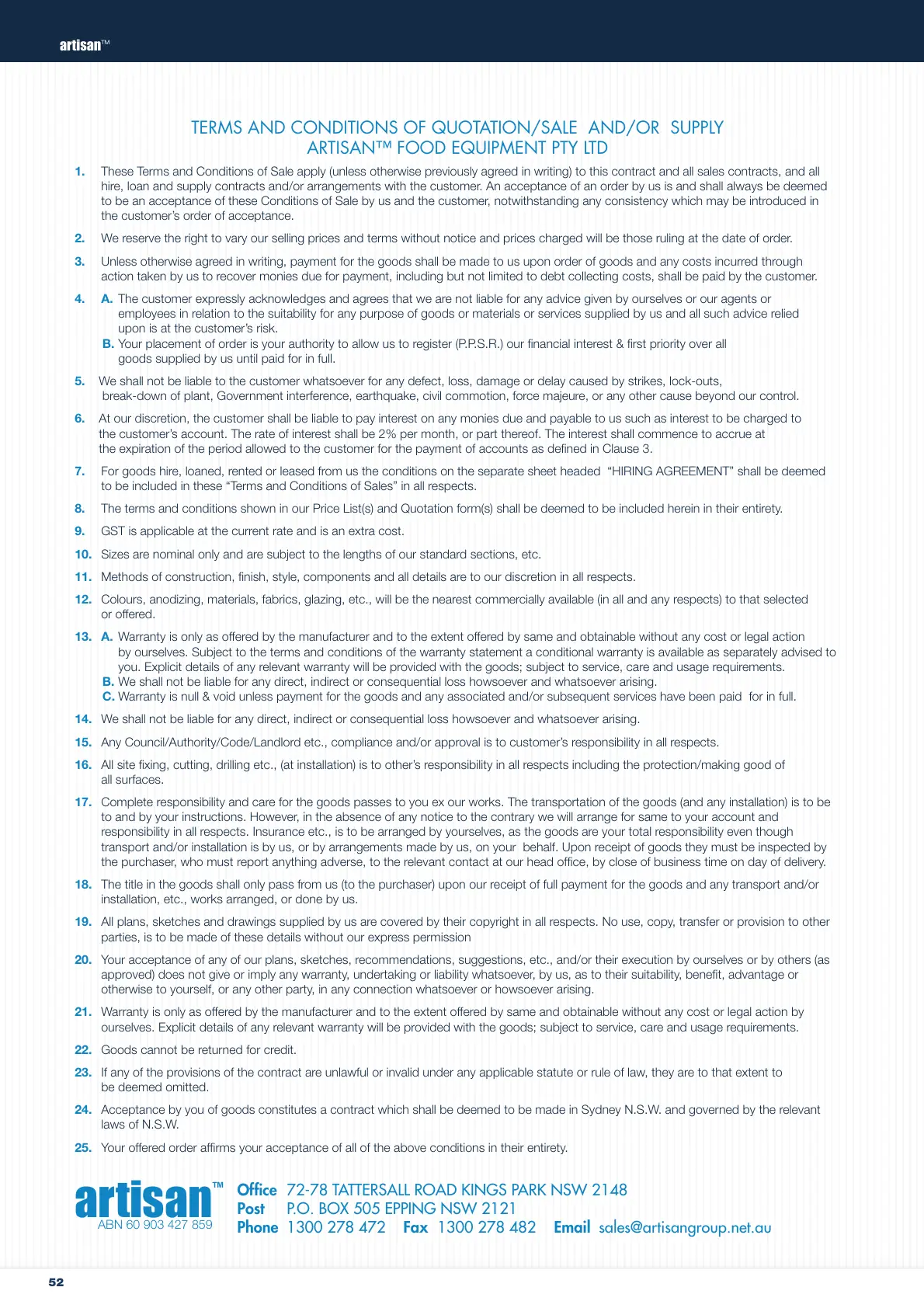 Phone 1300 278 472 Fax 1300 278 482 Email sales@artisangroup.net.au