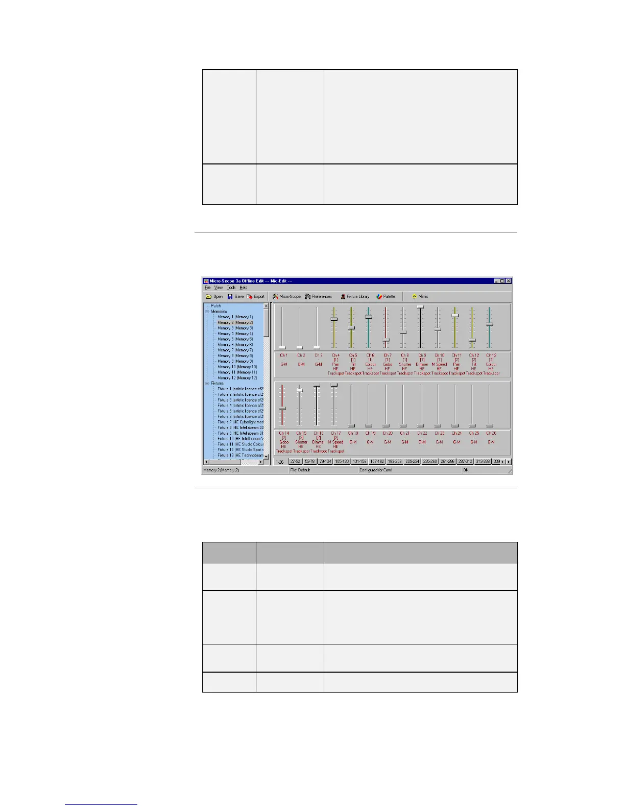 Each channel of each moving lamp or dimmer is displayed as a fader.