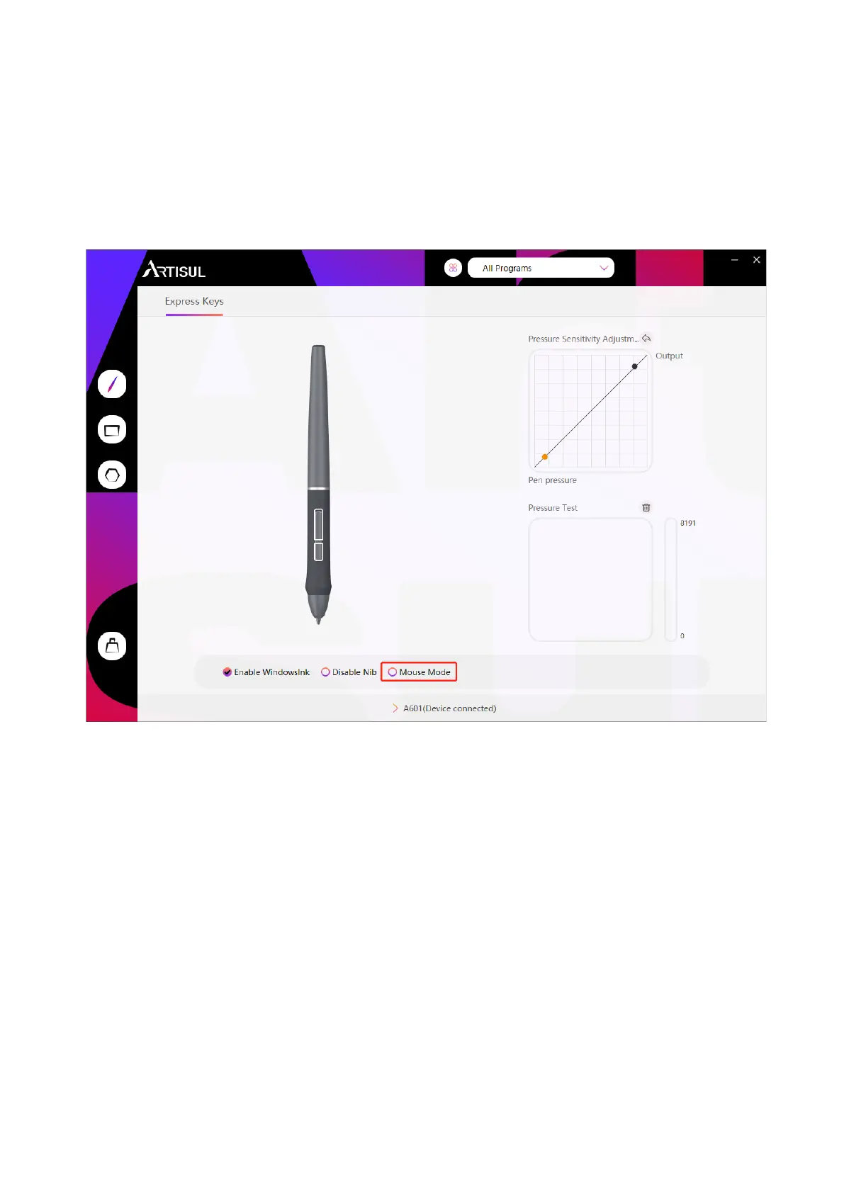 a program, customize the function of press keys, and adjust the pressure curve, the settings