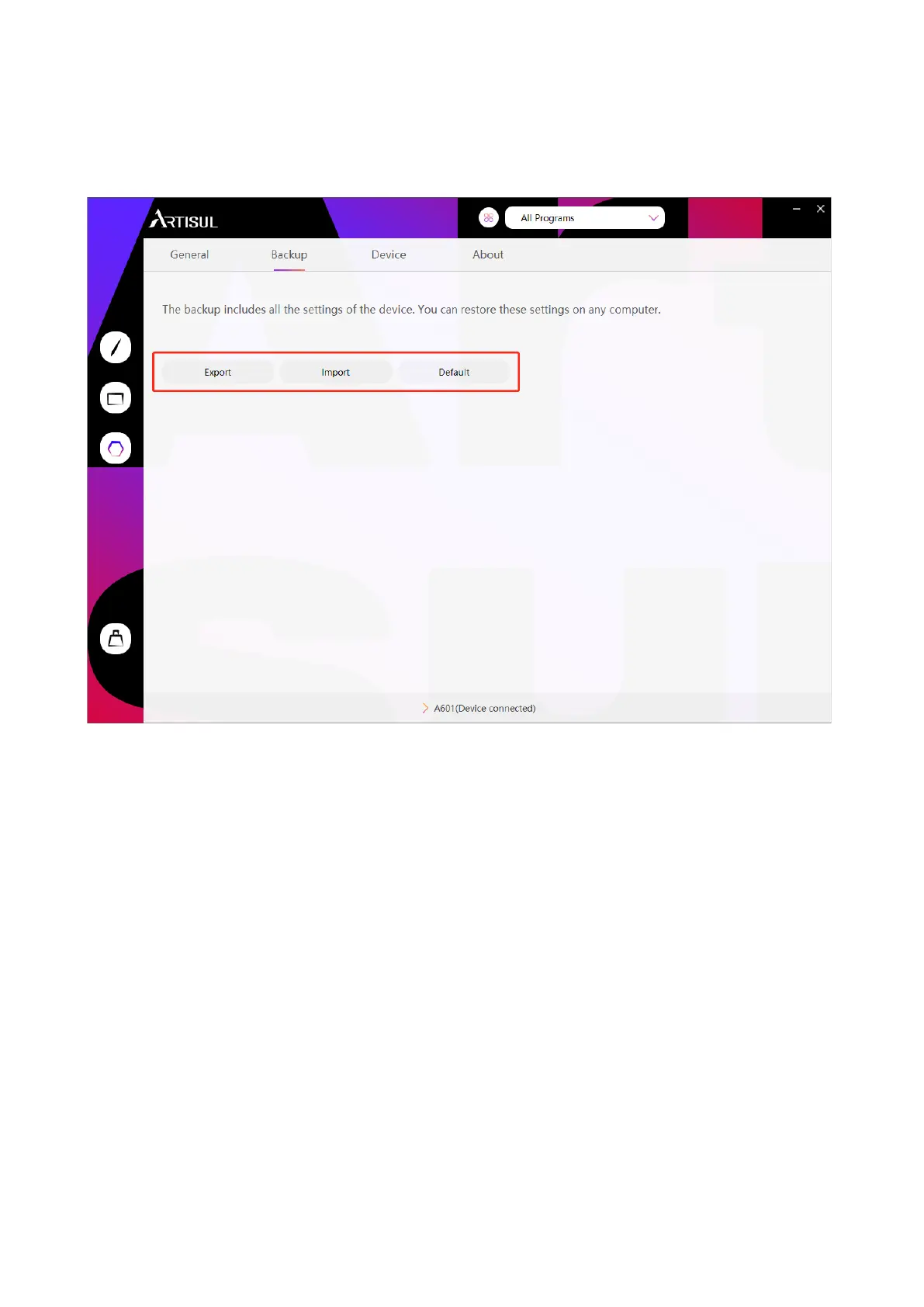 The driver supports exporting and importing your custom configuration data of the product,