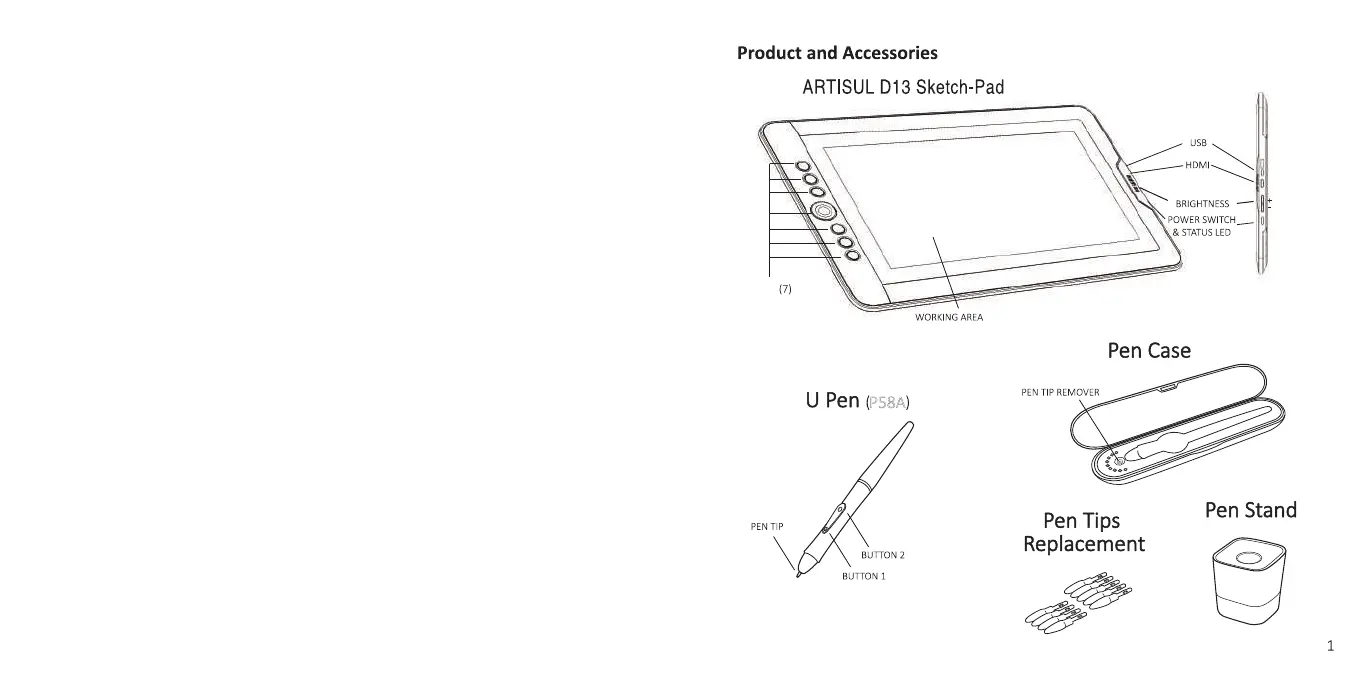 ARTISUL D13 - Product and Accessories; ARTISUL D13 Sketch-Pad Overview; U Pen (P58 A) Components; Pen Accessories Included