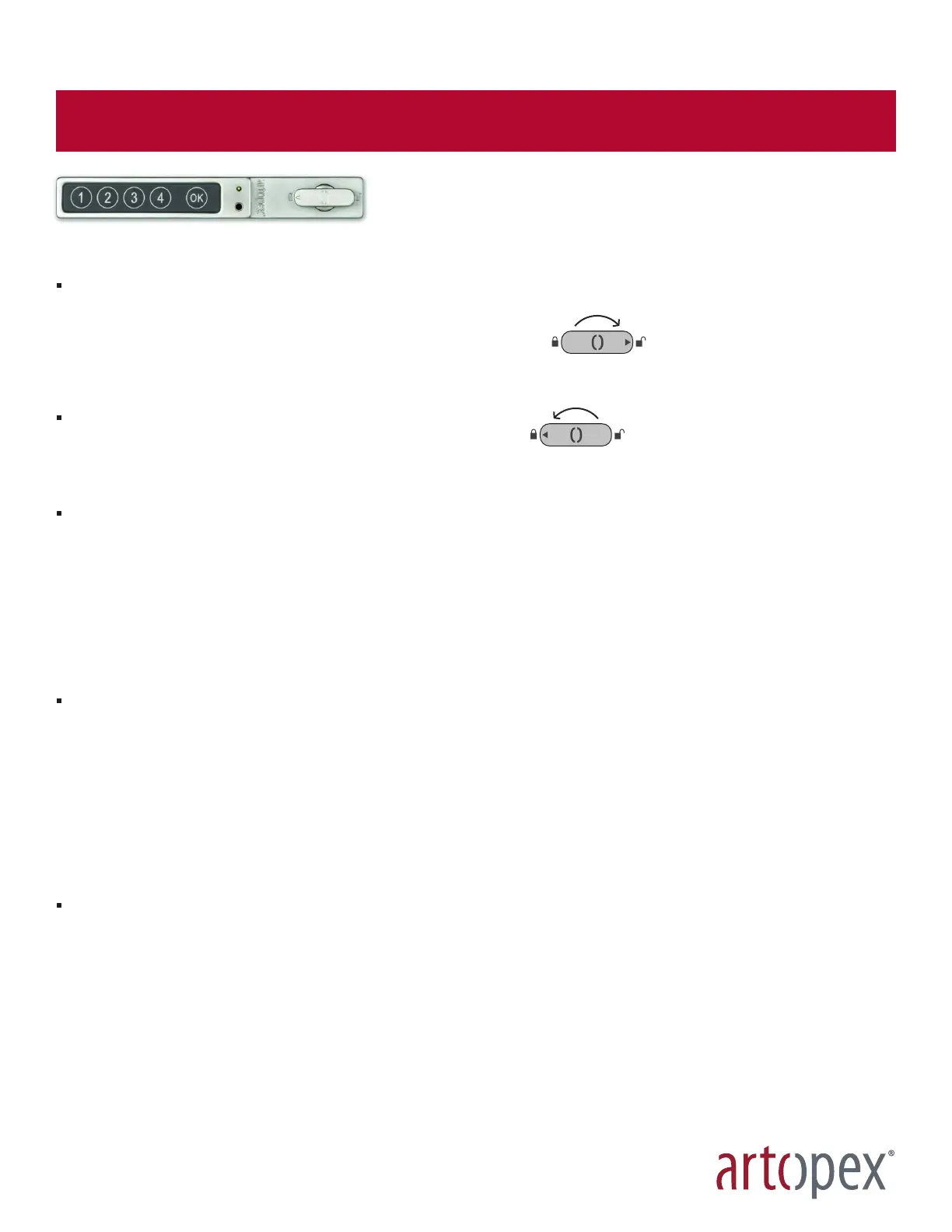 A 60 second alarm is activated after 4 attempts to open with an incorrect code. In the case of a power outage or exhausted