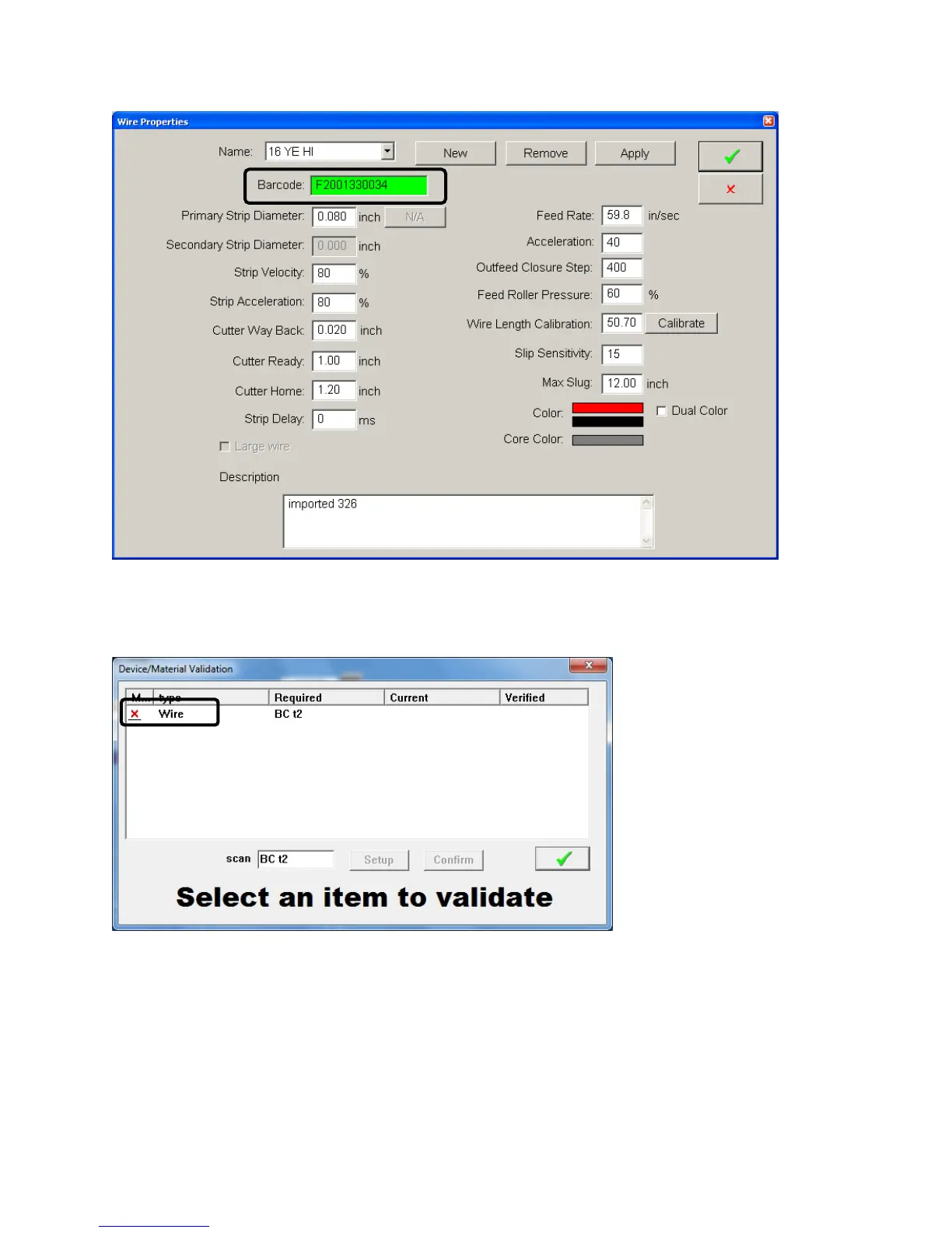 Scan the barcode of the wire. Then click the name Wire. If the barcode matches what is programmed the