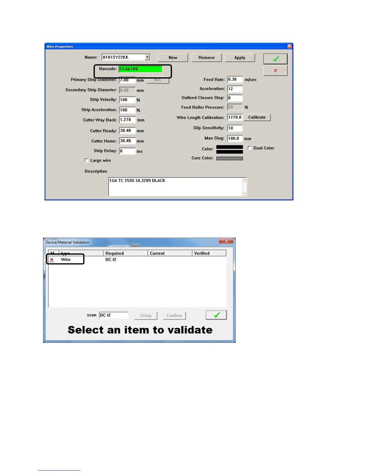 Scan the barcode of the wire. Then click the name Wire. If the barcode matches what is programmed the