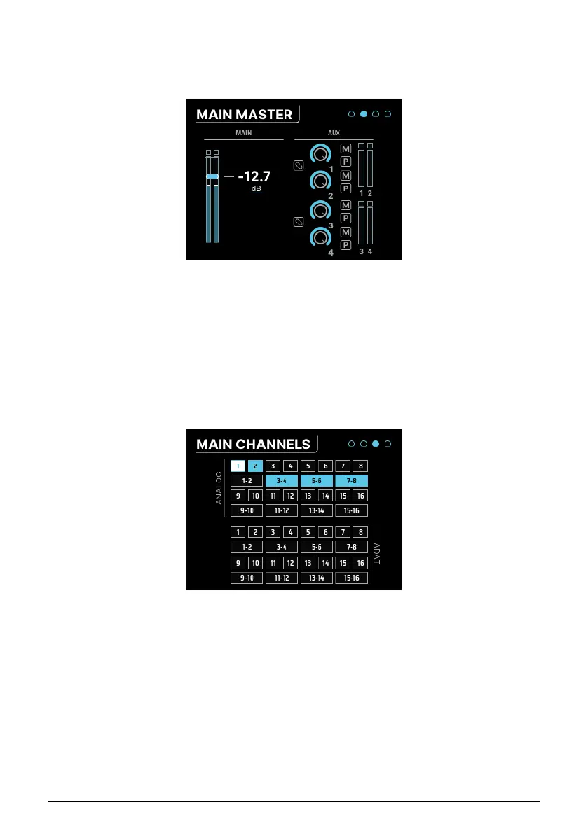 The last two pages of the MIXER menu are the MAIN CHANNELS pages. Here, you can scroll