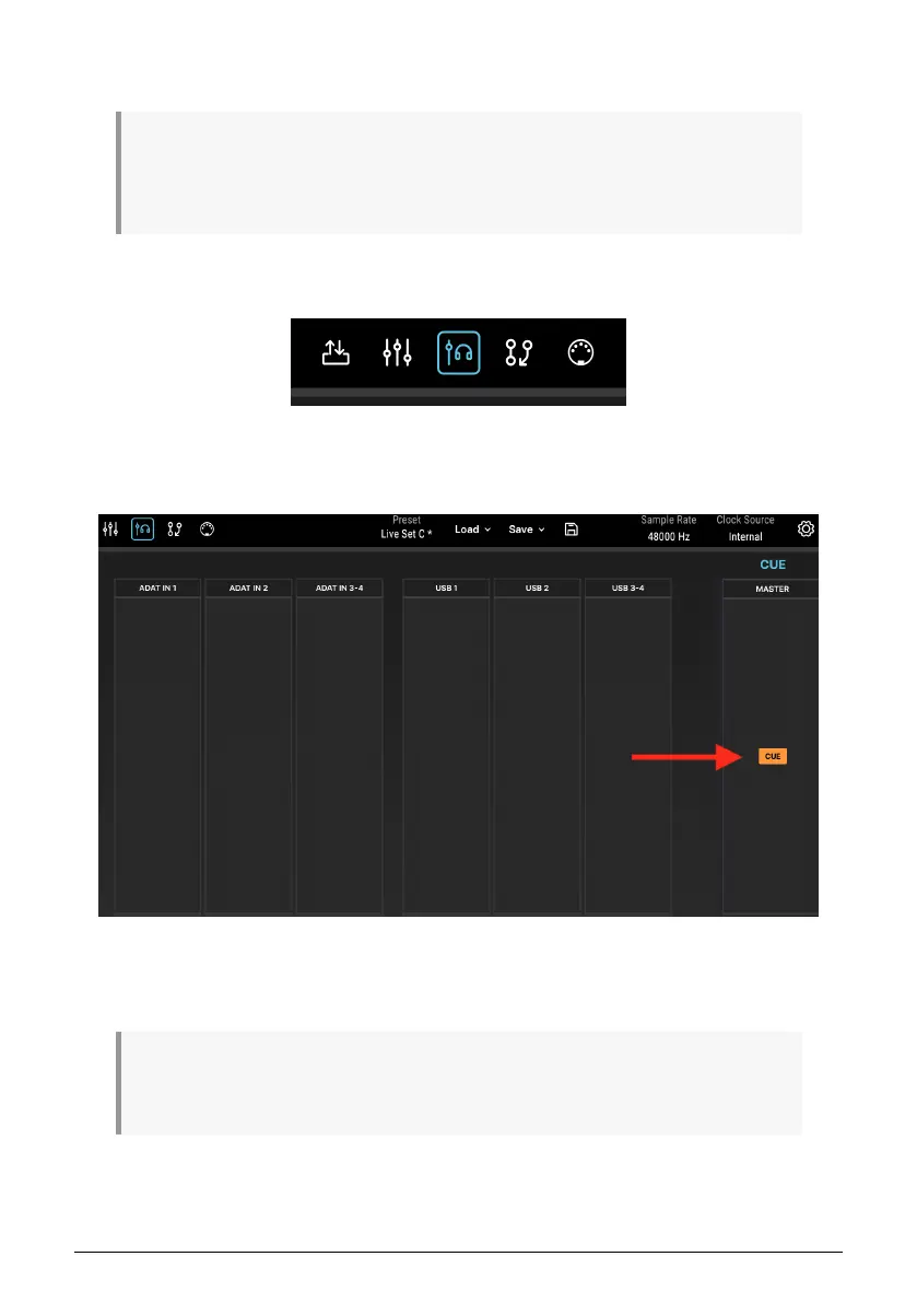 button above the Master fader, which turns the Cue mix on or off. This corresponds to the