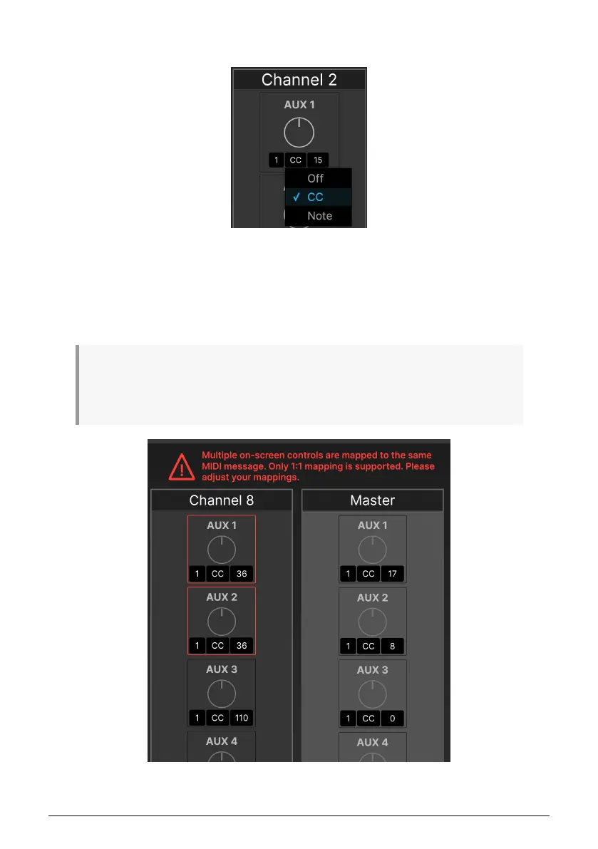 Note that each on-screen control must have its own unique channel+CC/Note+value assignments