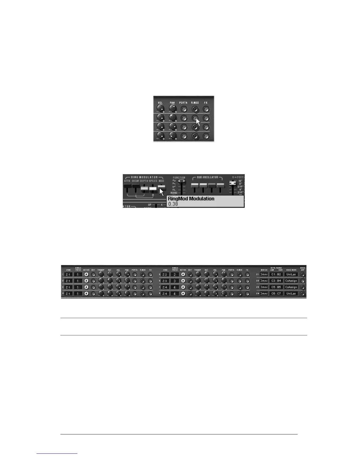 Next lower the «Modulation» knob in order to mix the level of the ring modulator with