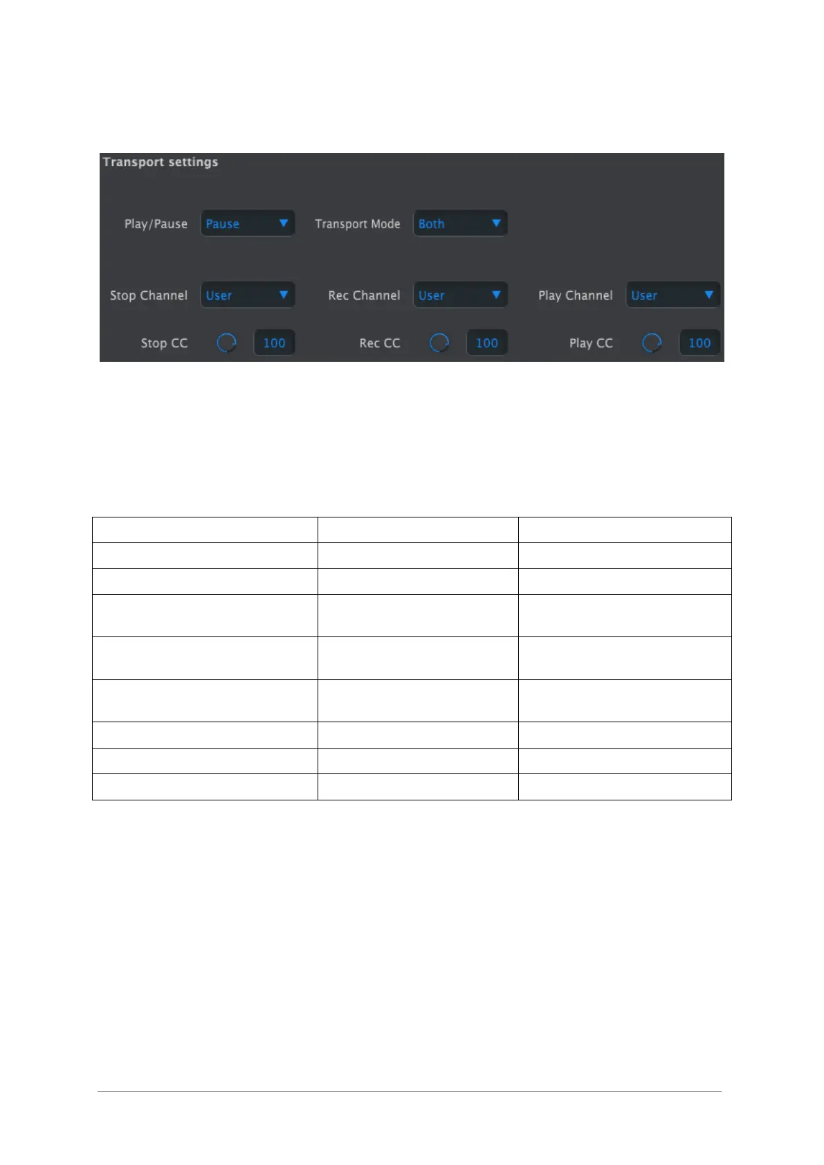Stop/Record/Play: You can define the MIDI channel and CC number for each of the three