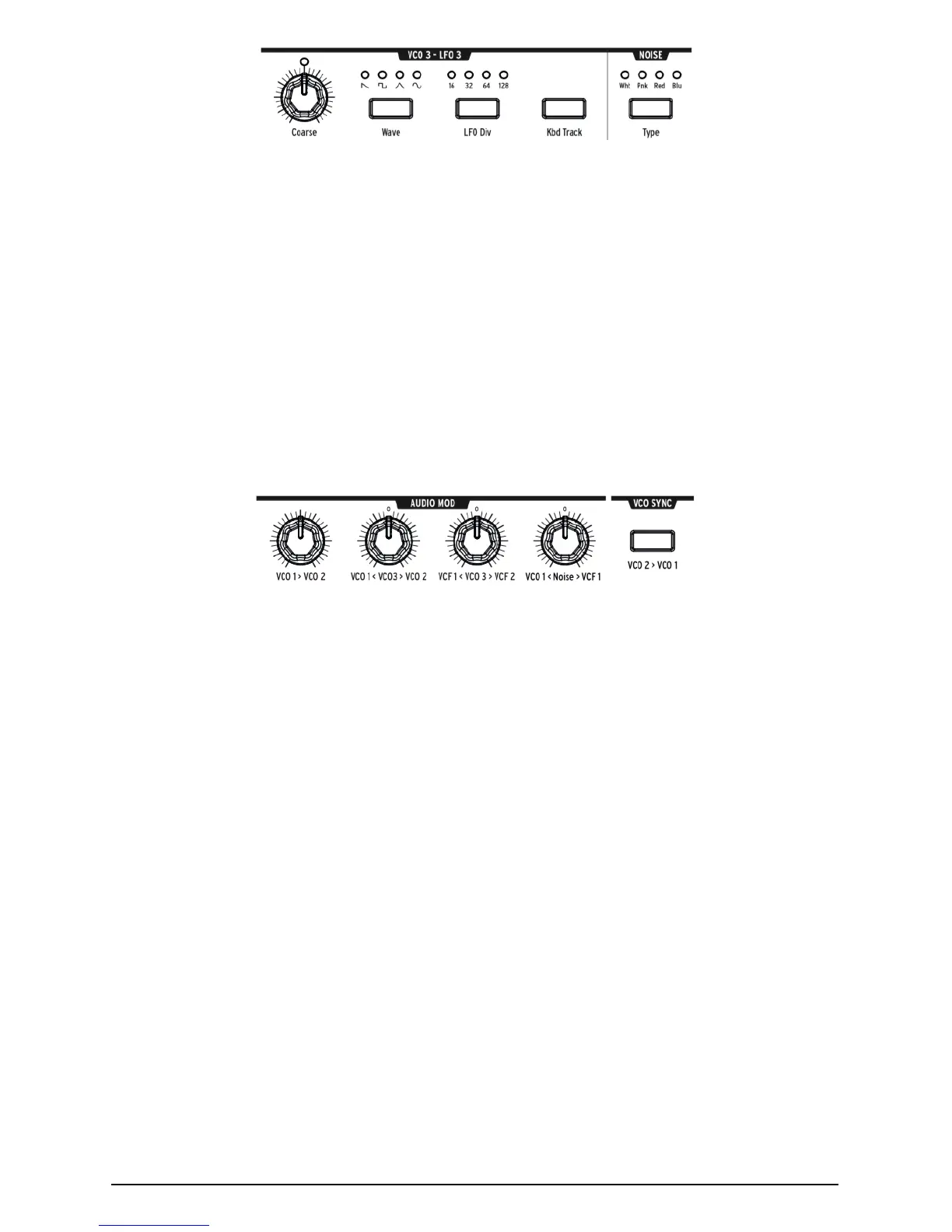 • VCO 1 < VCO 3 > VCO 2 lets VCO 3 modulate VCO 1 or 2. It modulates