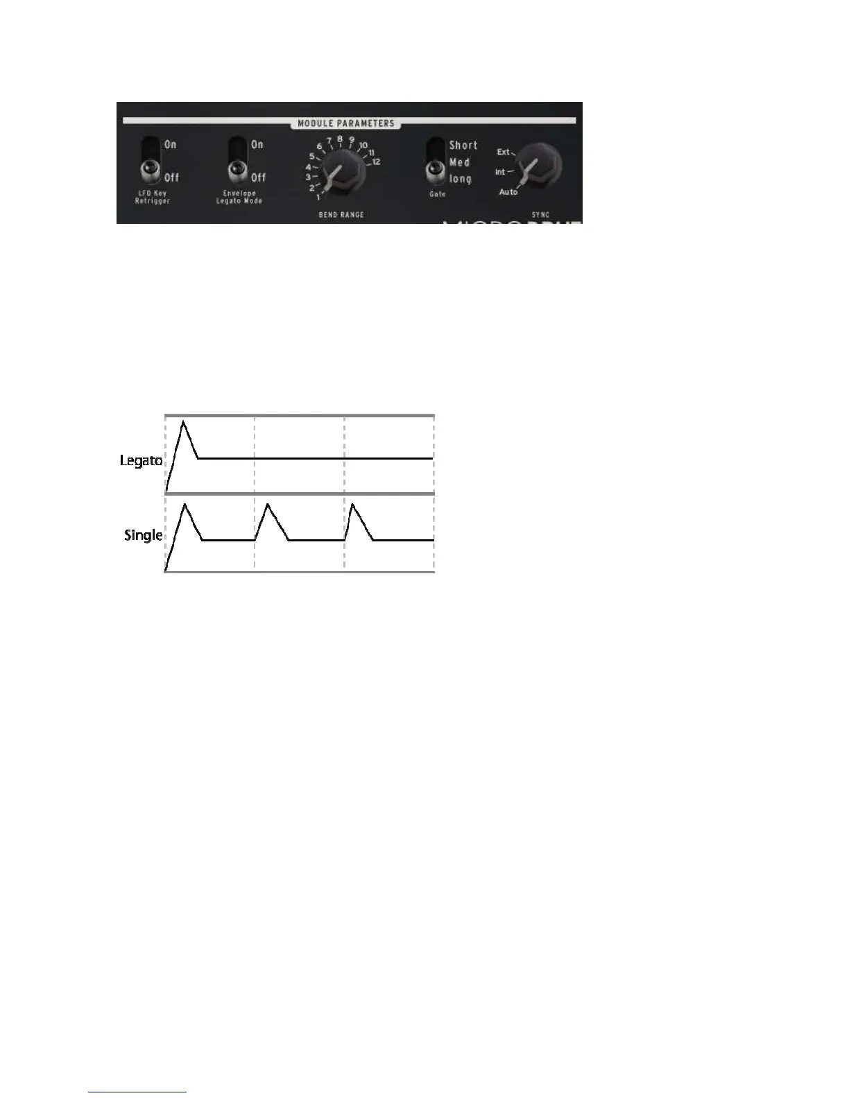 • Single/Legato off - Legato allows you to trigger new notes in the envelope but