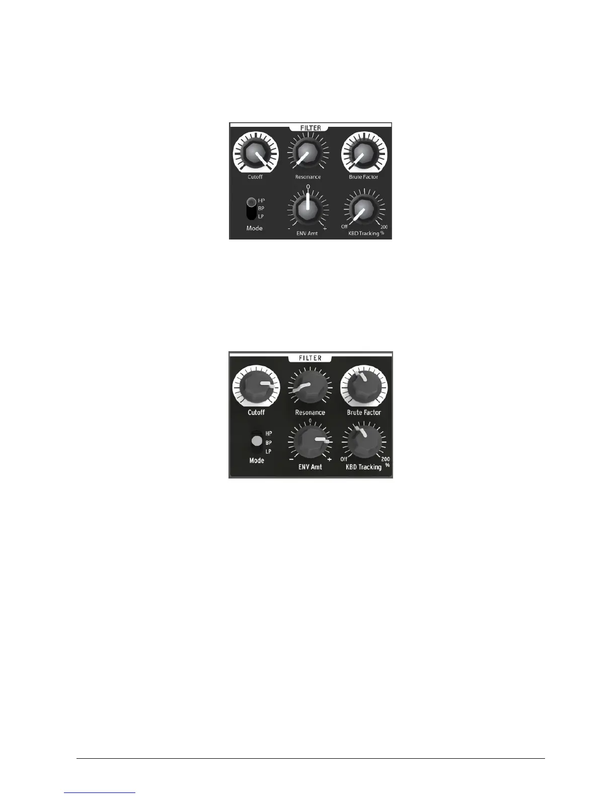 Experiment with different settings of the RESONANCE and CUTOFF controls to hear