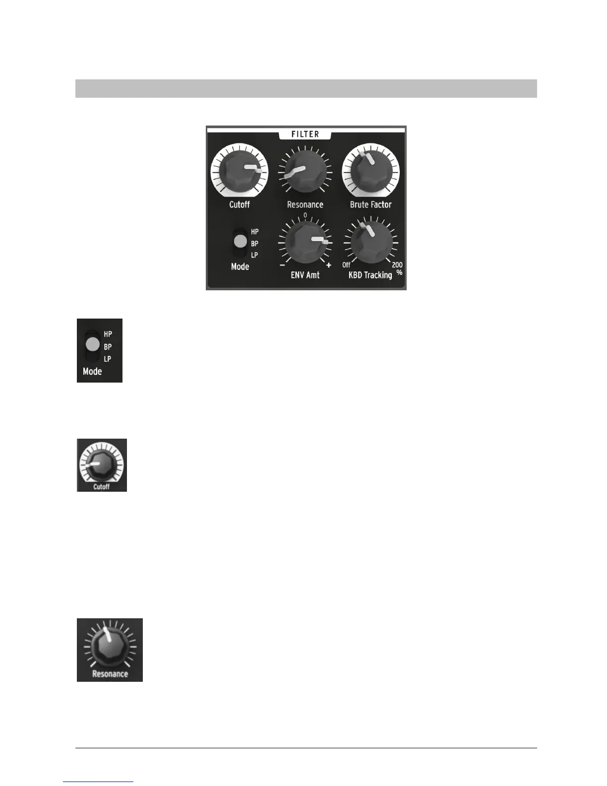 previously (LP, BP, HP). The cutoff can be controlled by the keyboard, the Envelope,