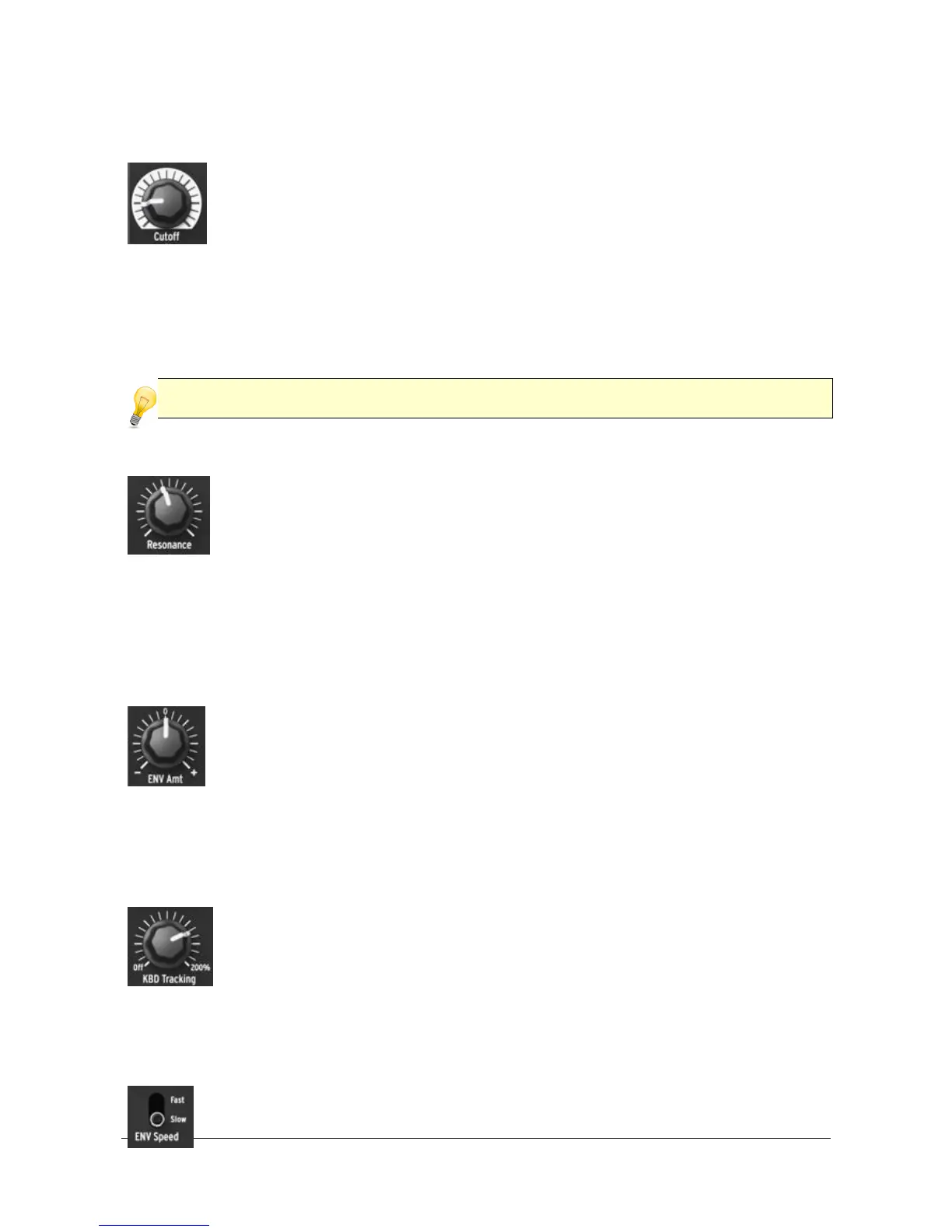 This knob adjusts the filter’s cutoff frequency. The frequency range goes