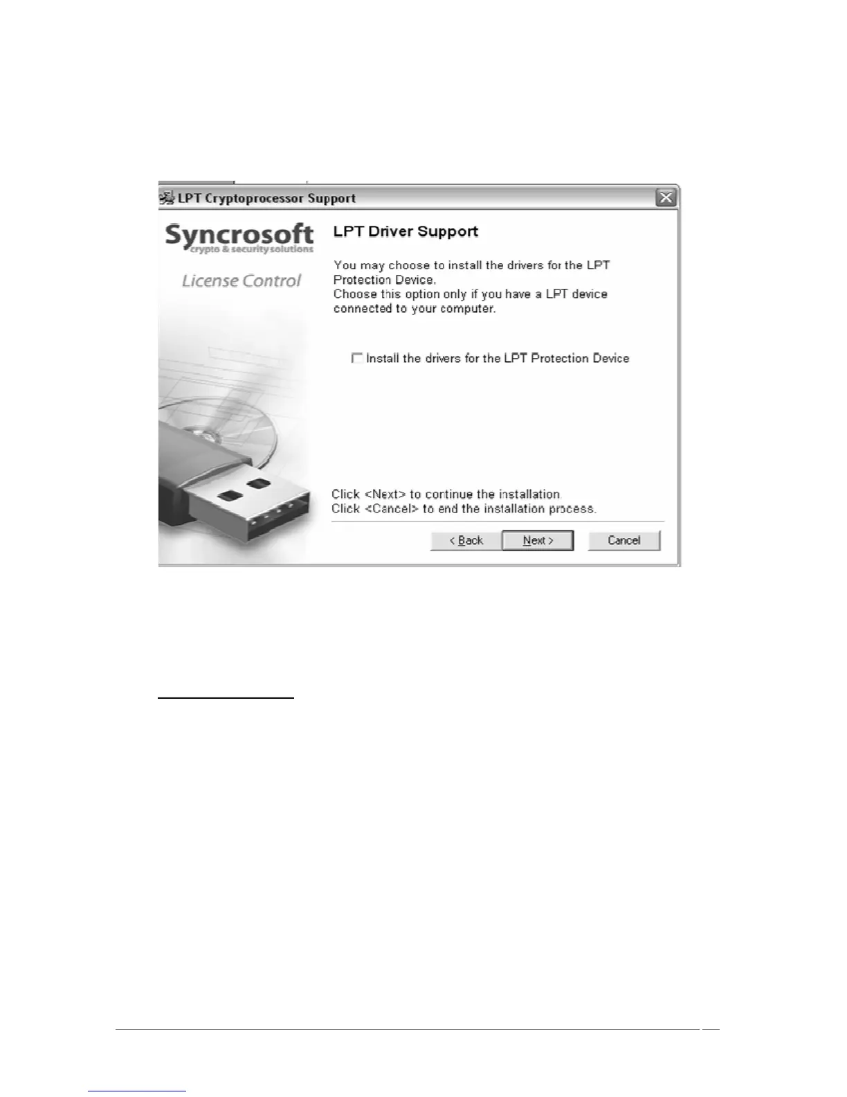 Next, the installation program proceeds with installation of the Syncrosoft USB key driver