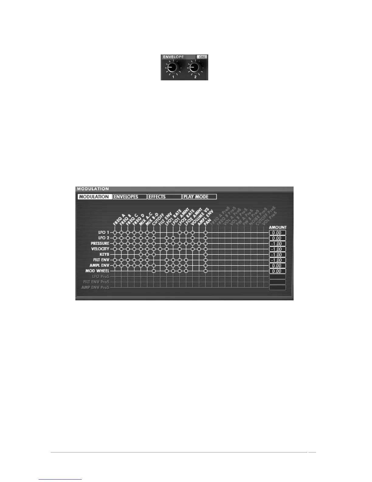 of the three envelopes, the modulation matrix, playing mode (Prophet VS only), and the effects.