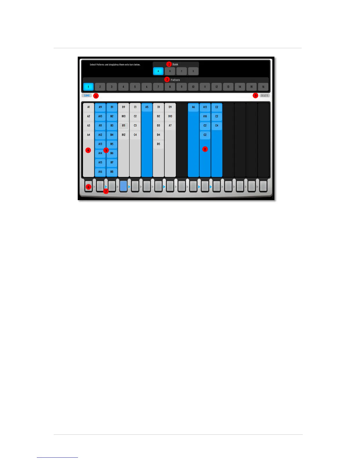 The Song panel allows you to chain patterns together to create longer sequences, or a