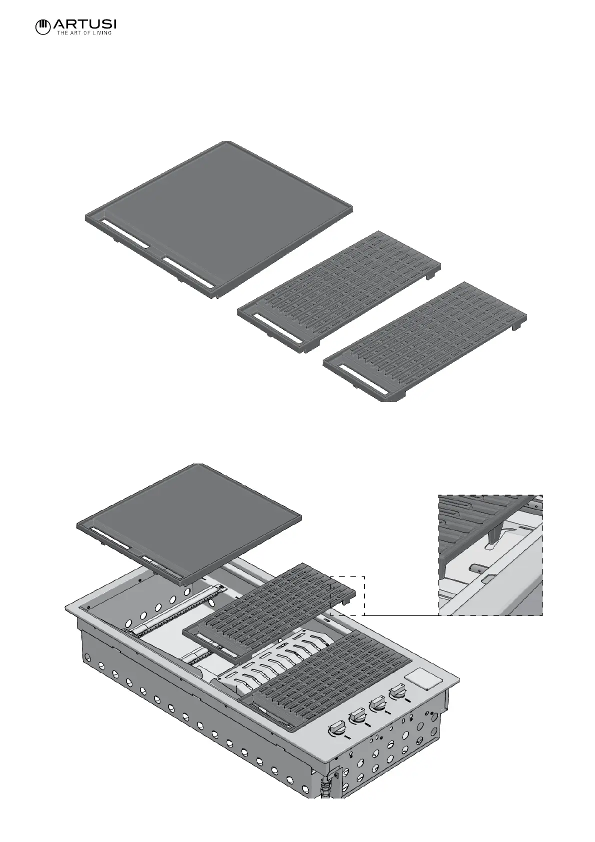 4. Place the cooking plate and grill sections in the desired positions, making sure that the ame diffusers are under the grill
