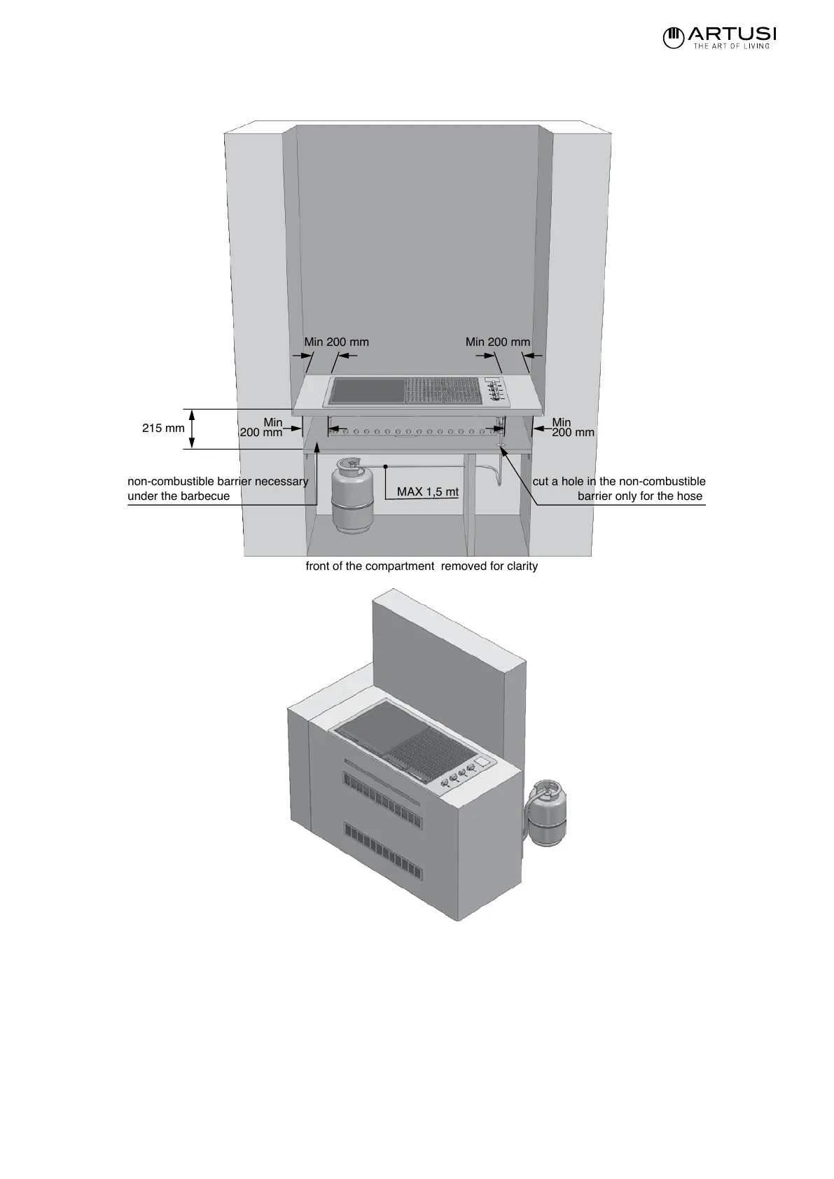 The LPG cylinder may be connected inside the object-holder compartment of barbecue only if it has the dimensions shown