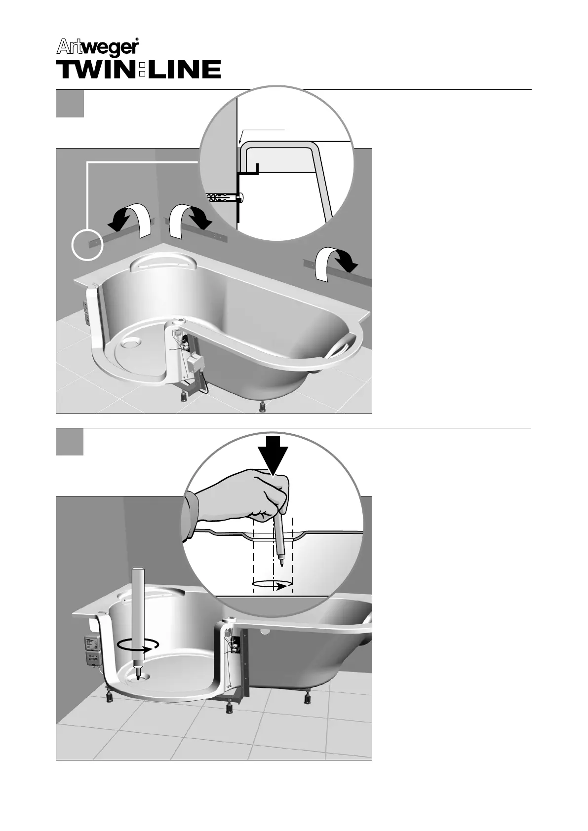 Wanne einhängen und waagrecht einrichten.