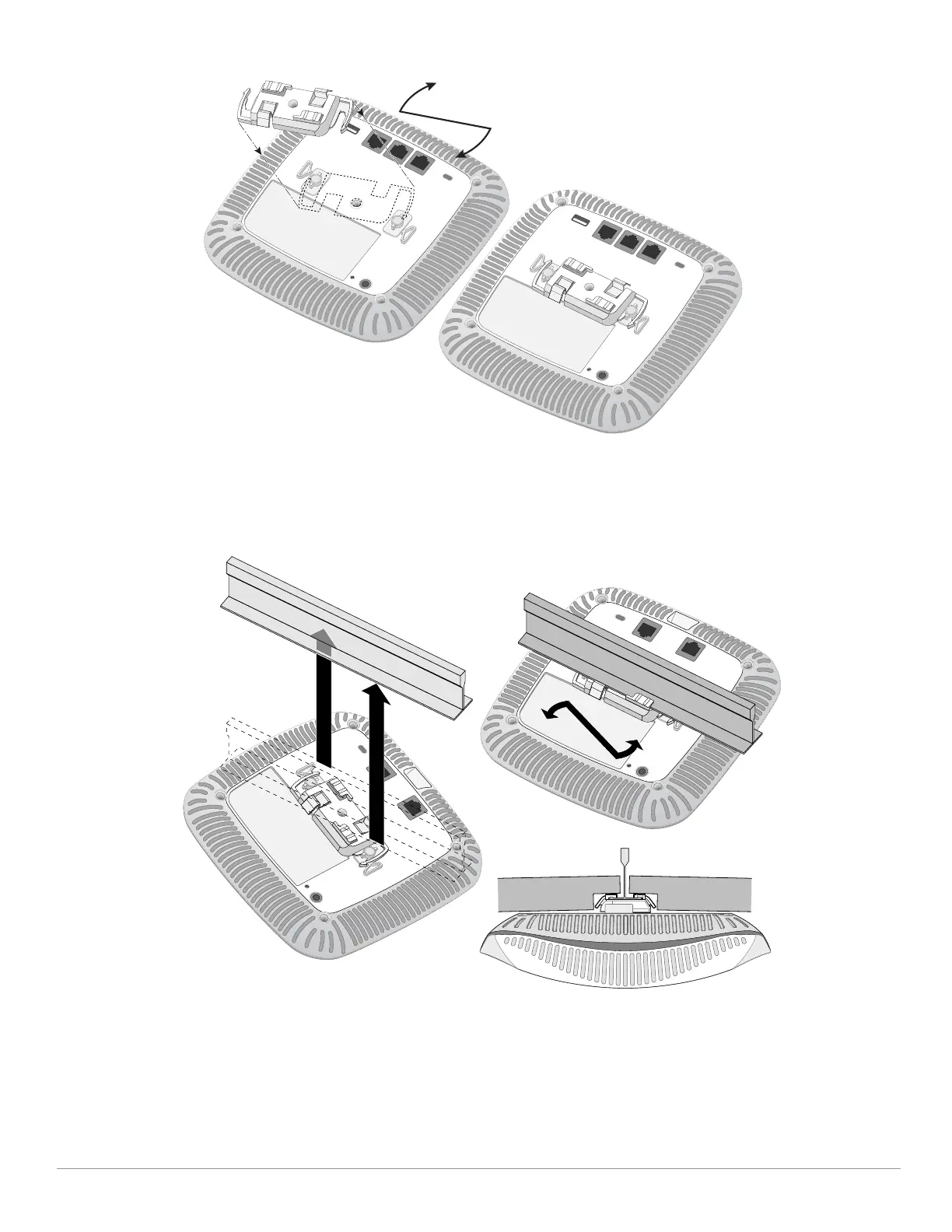 6. Pushing toward the ceiling tile, rotate the AP clockwise until the device clicks into place on the ceiling tile rail.