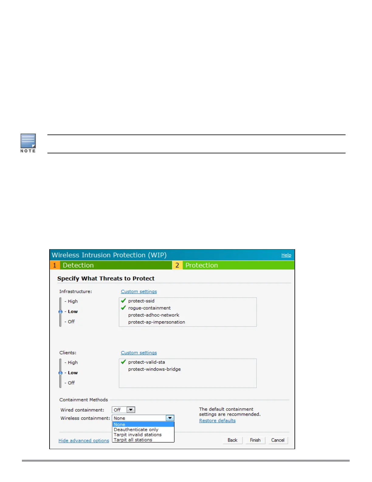 l Wireless containment—When enabled, the system attempts to disconnect all clients that are connected or