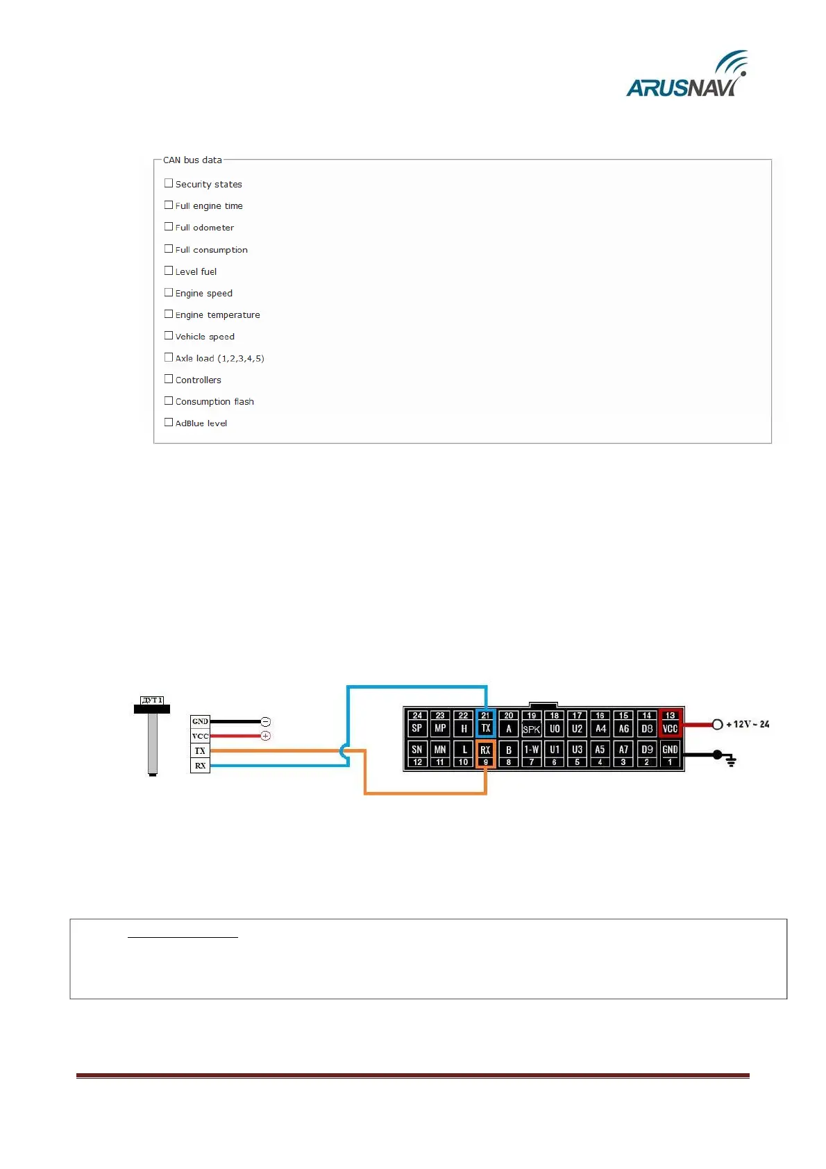 The connection of the fuel level sensor via RS232 interface (to contacts ‘9’ and ‘21’ of the main
