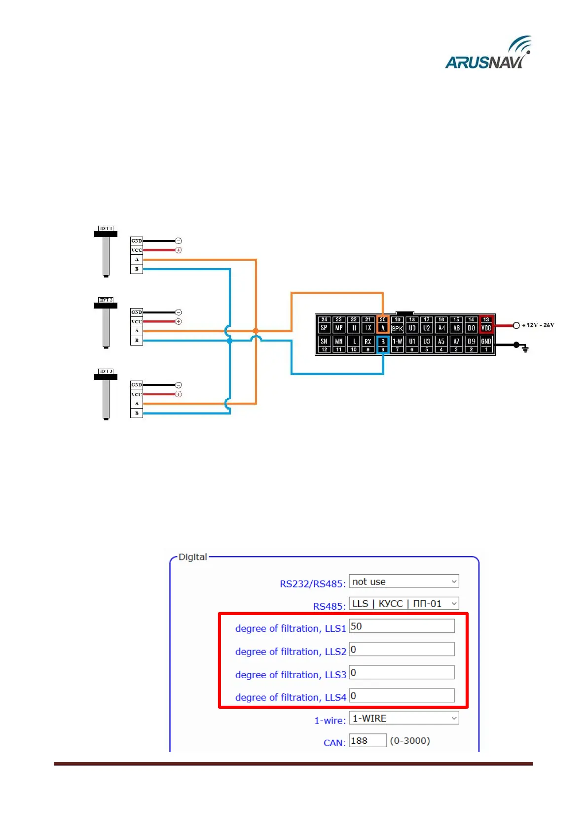with external digital (RS-485 interface, 12 bit) fuel level sensors (capacitive, ultrasonic, etc.) that