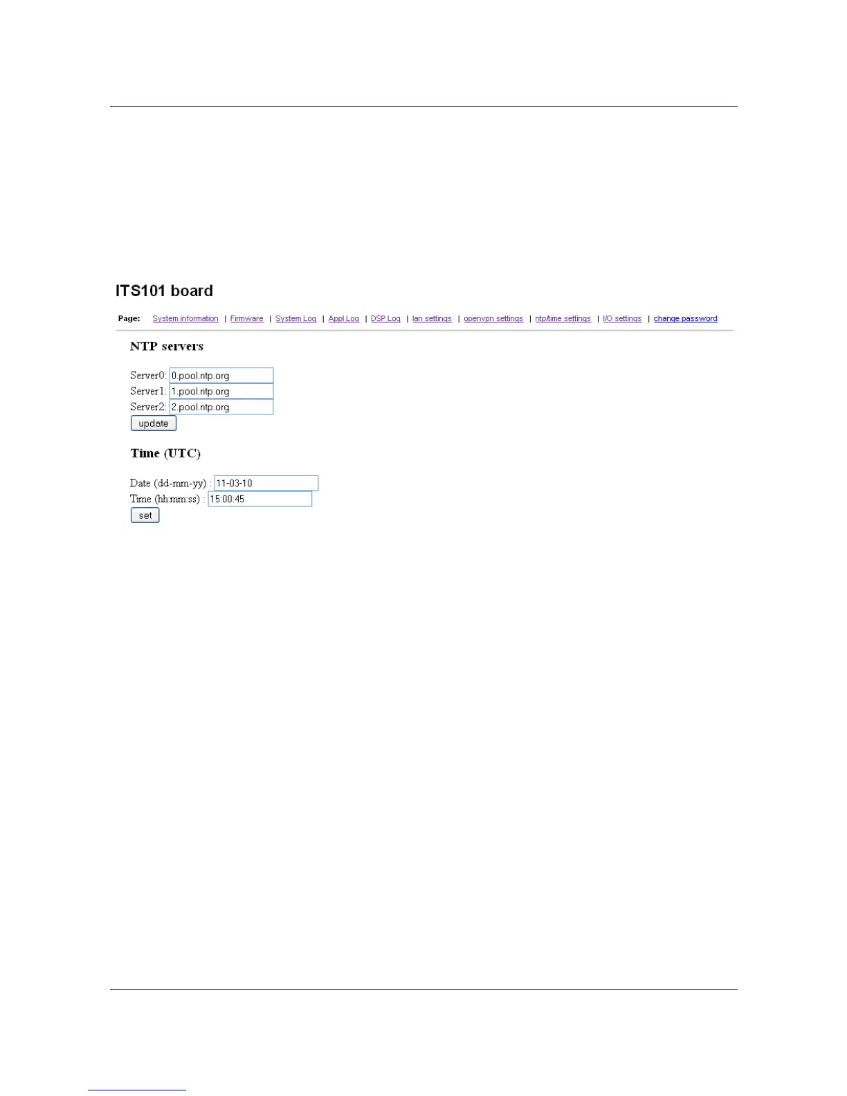 The date and time can be set using the “ntp/time settings” page on the web service as shown