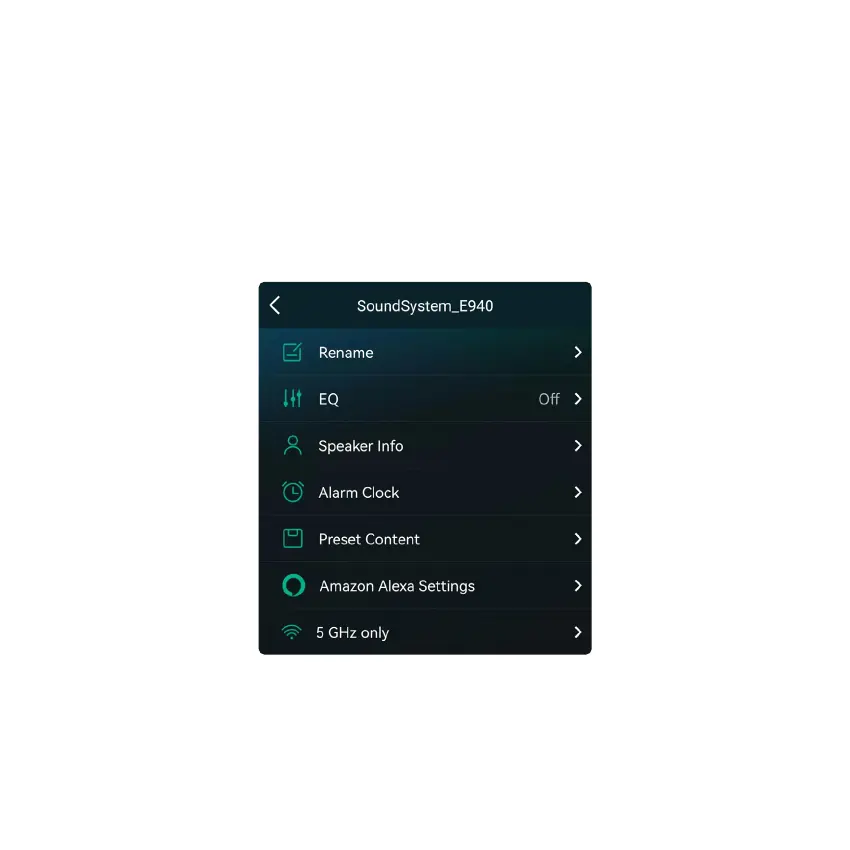 Speaker info: Display device information like IP address, Mac address, SSID, firmware version, factory reset, etc.