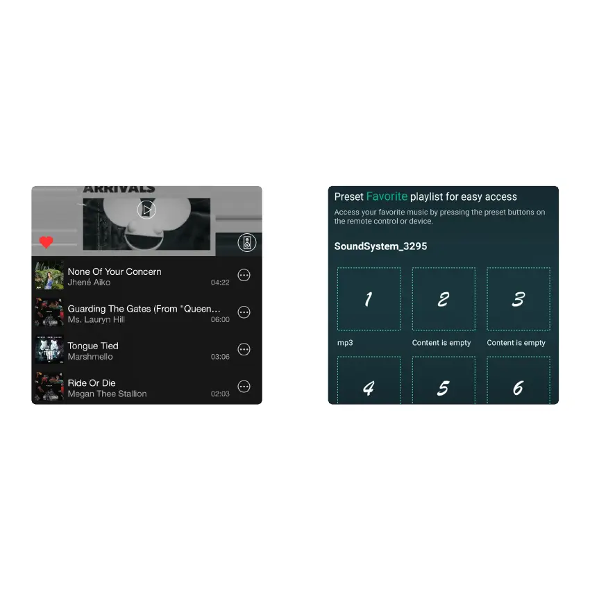There are 6 buttons on the remote control, users can preset play lists (Only the lists with speaker icon can