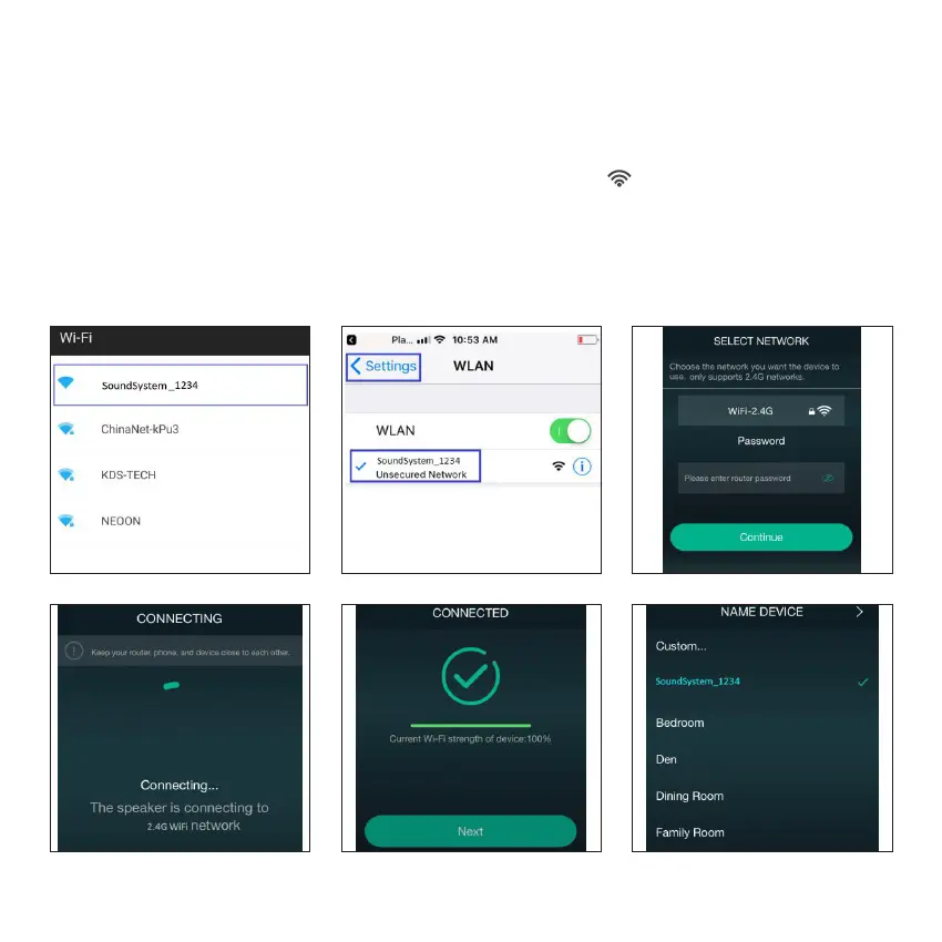Mobilgerät zum Hotspot SoundSystem_xxxx Sie sehen ein WiFi-Logo. (Drücken Sie kurz die Reset-