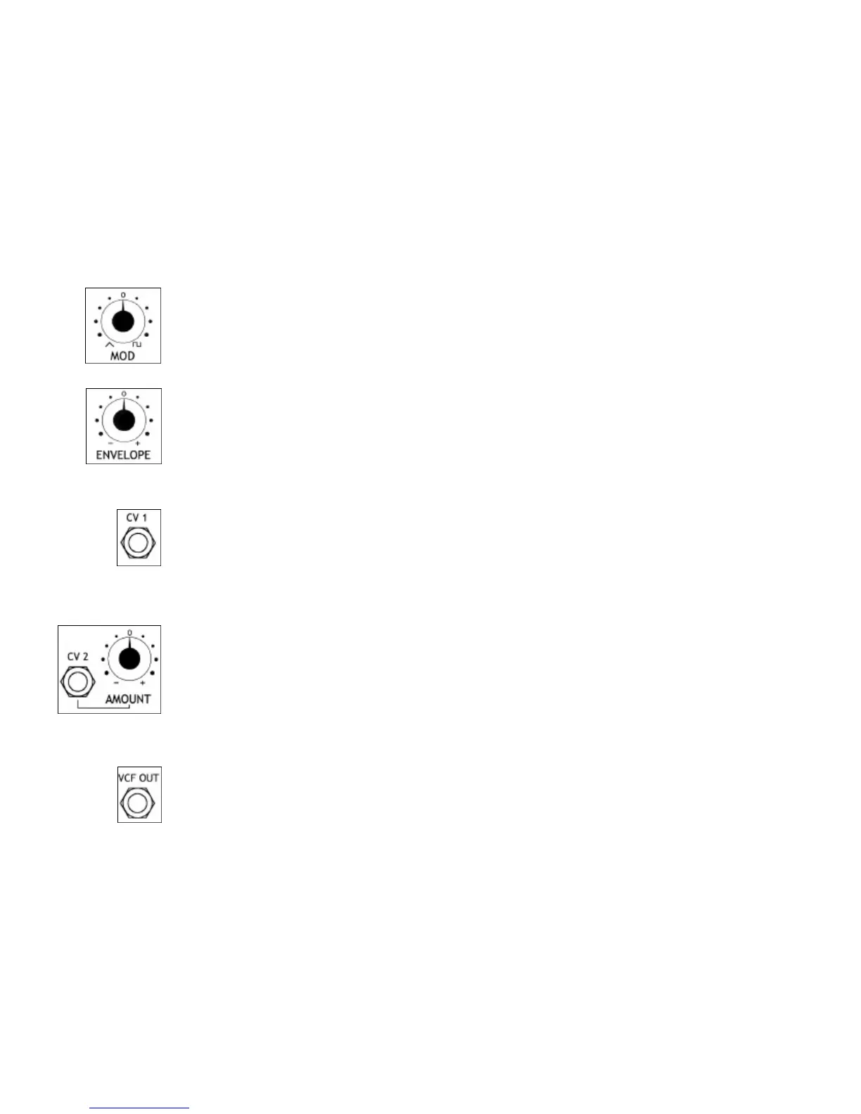 This is the main control voltage input for the VCF and has control characteristics of IV/OCT. An internal patch is