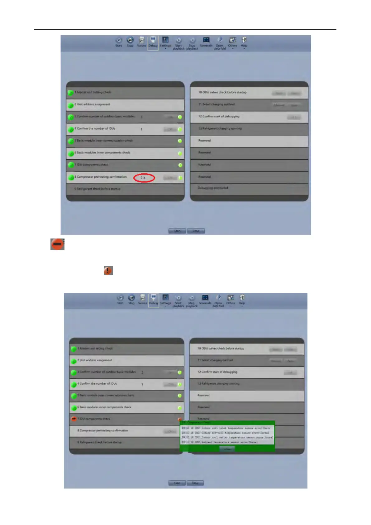 (after troubleshooting, the unit automatically enters the next step if no "OK" exists or click "OK" to enter