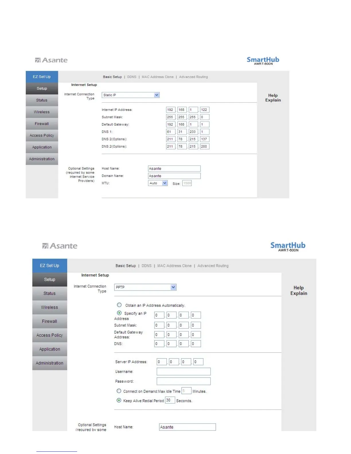 Select Static IP if your ISP provided you the static IP address, Subnet Mask, Default