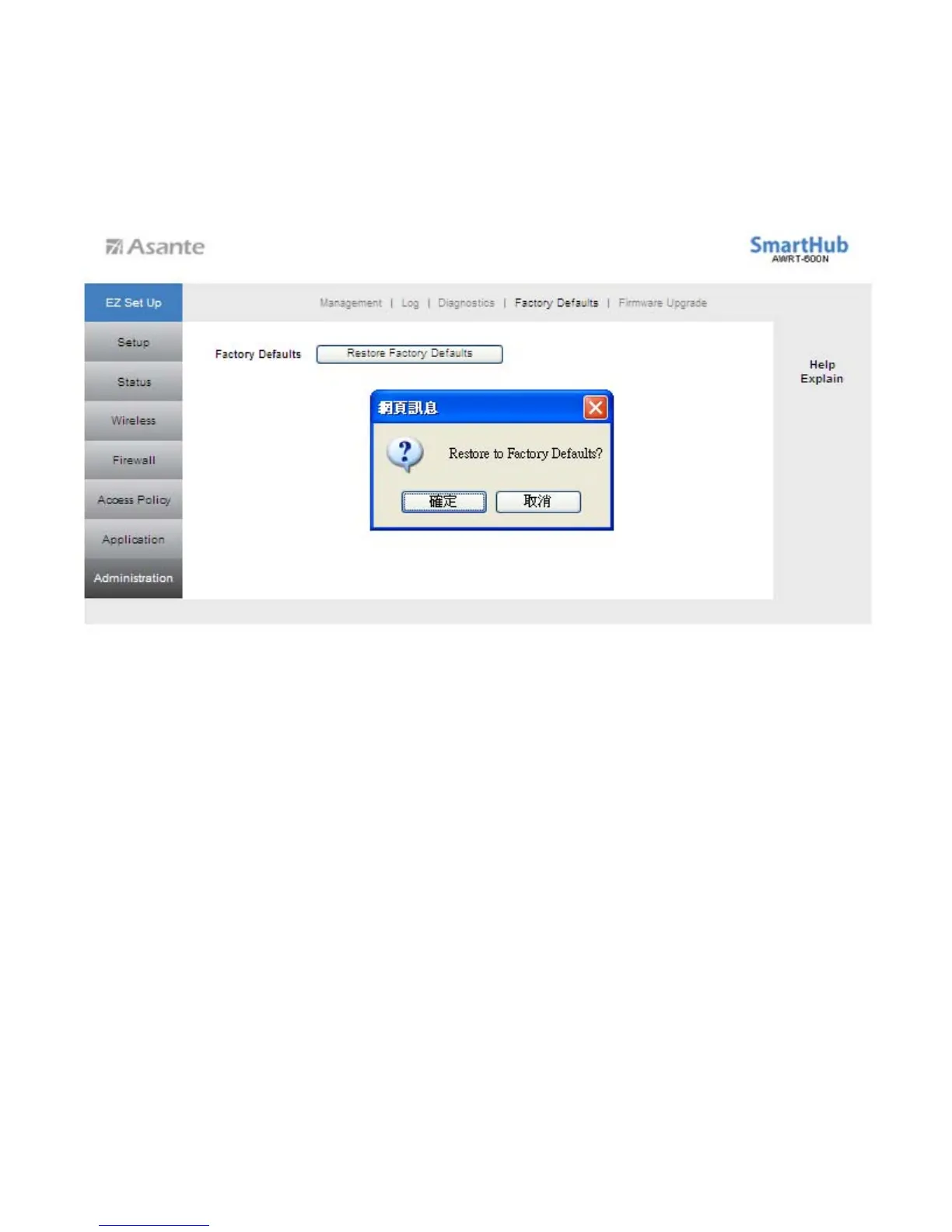 Asante AWRT-600N - Administration > Factory Defaults