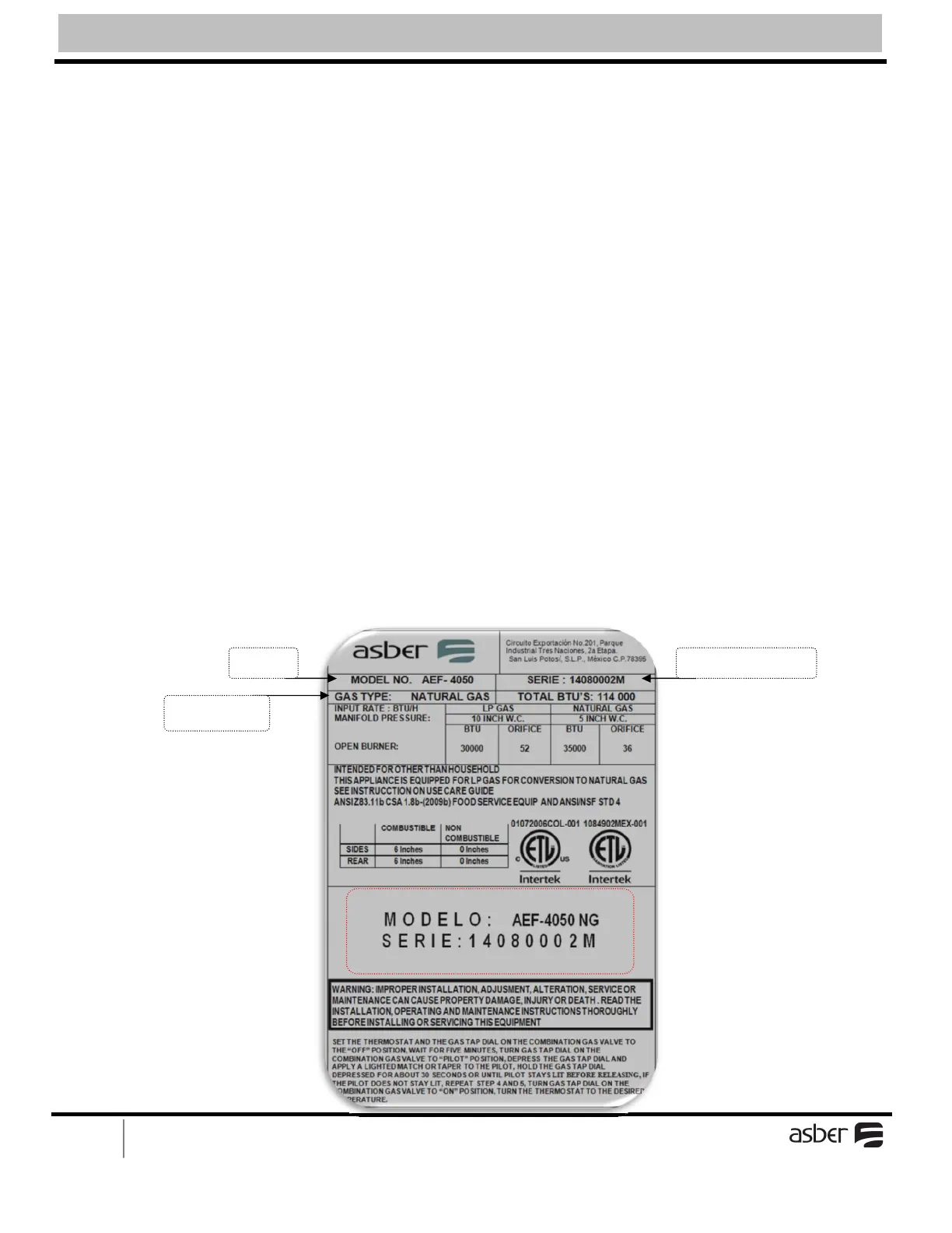 Information on this plate includes the model, serial number, BTU / hour input of the burners operating