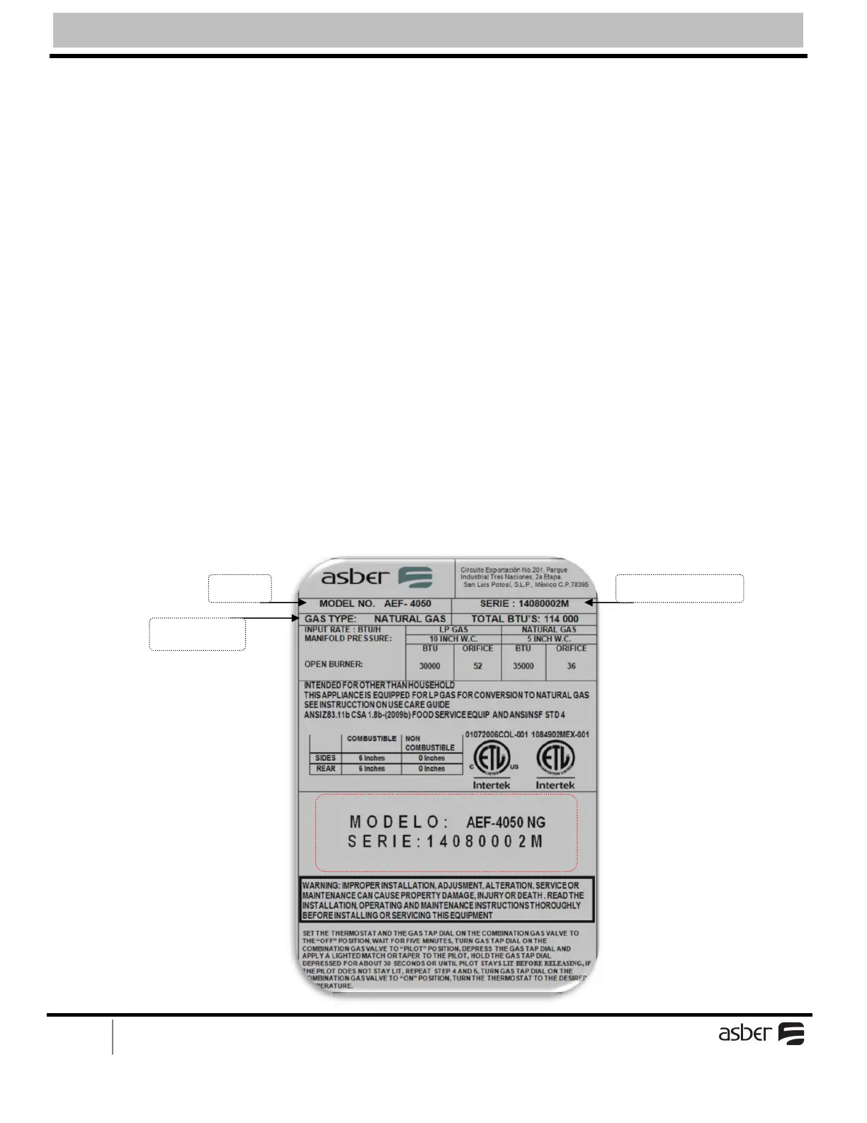 Information on this plate includes the model, serial number, BTU / hour input of the burners operating